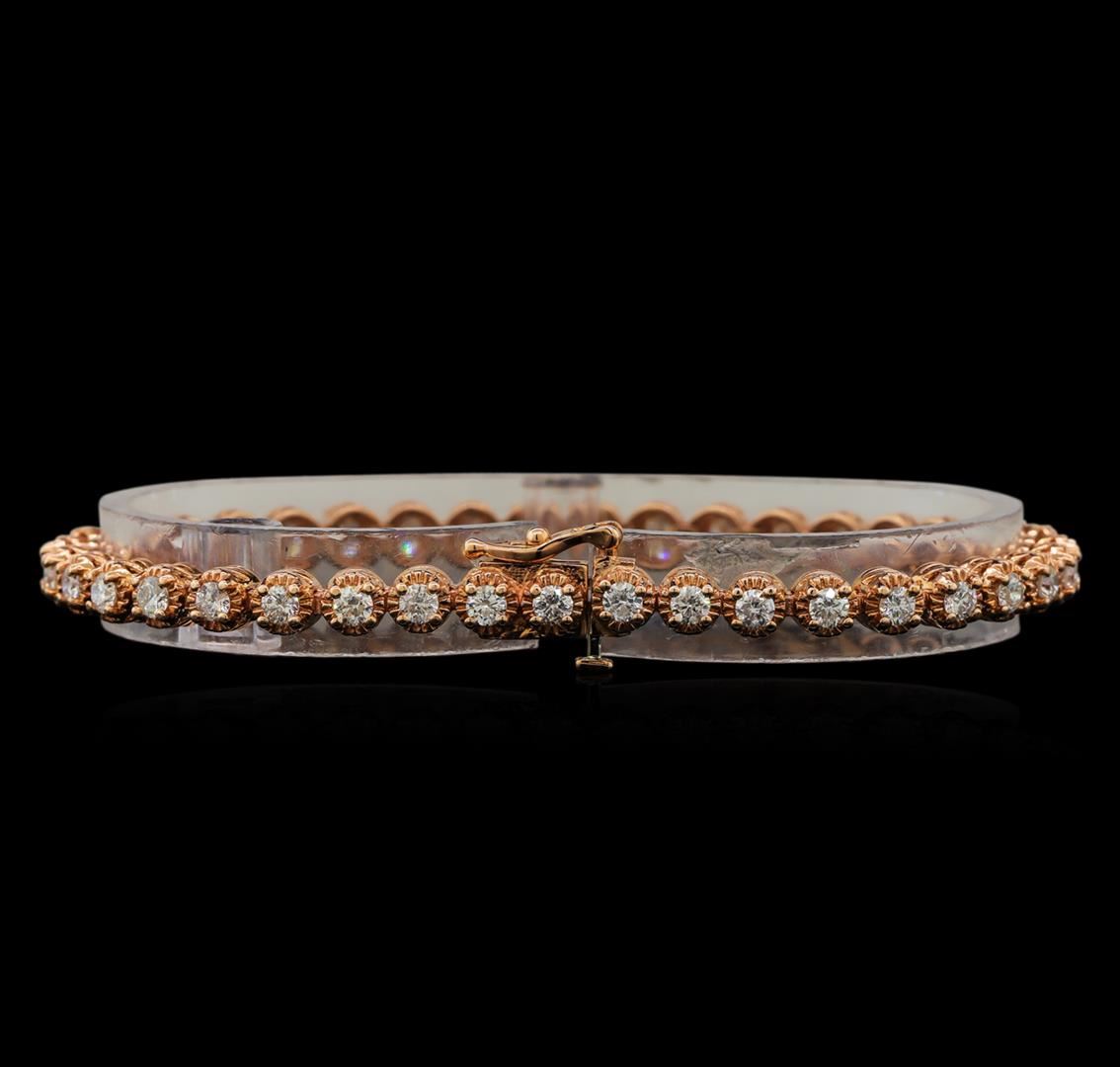 One electronically tested 14KT rose gold ladies cast diamond tennis bracelet with a hidden box clasp with safety closer with a bright polish finish. Measurements: 7" in length Identified with markings of "14K". Condition is new. Containing: Thirty-Nine prong set round brilliant cut diamonds, measuring 2.80 - 2.80 x 1.68mm (depth est.) approximate total weight of 39 Stones = 3.28ct. Clarity: SI-2 to I-1. Color: H - I, Cut is Good. All diamonds are graded in the mounting, unless otherwise stated. Total Weight of Diamonds 3.28ct. Total Weight of Tennis Bracelet 14.70 grams. GGL Appraised.