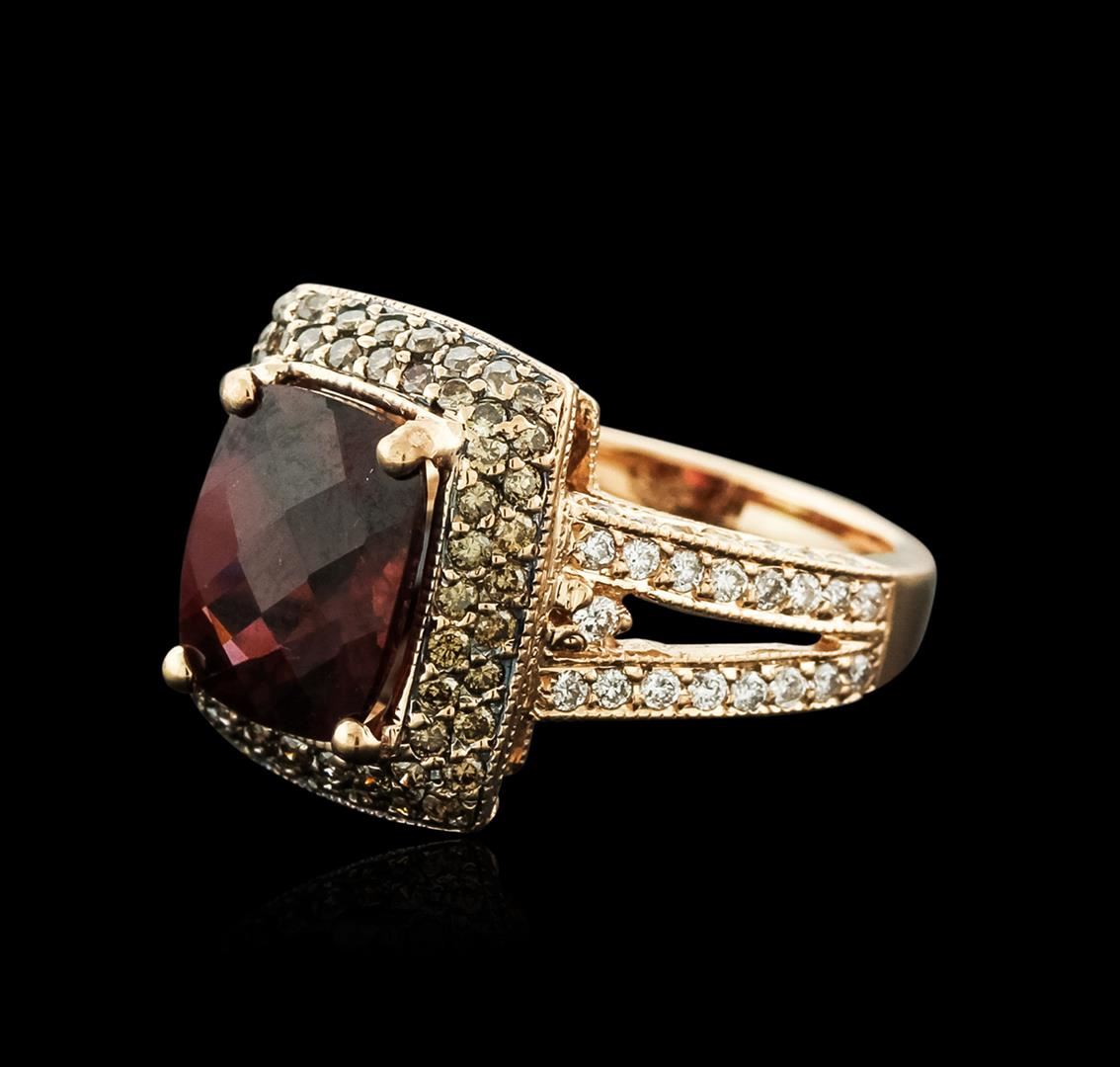One electronically tested 14KT rose gold ladies combination cast & assembled tourmaline and diamond ring with a tapered shank with a bright polish finish. Identified with markings of "14K". Condition is new. Containing: One prong set rectangular cushion modified mixed cut natural rubellite, measuring 10.04 x 8.07 x 5.66mm, approximate weight of 3.30ct., clarity is eye clean, type III, medium, moderately strong, reddish purple color, (GIA rP 5/4), cut is good. Sixty-Six prong set round brilliant cut diamonds, measuring 1.10 - 1.10 x 0.66mm (depth est.) approximate total weight of 66 Stones = 0.32ct. Clarity: SI-2 to I-1. Color: J - K, Cut is Good. Fifty-Nine round brilliant cut diamonds, measuring 1.30 - 1.30 x 0.78mm (depth est.) approximate total weight of 59 Stones = 0.47ct. Clarity: SI-2 to I-1. All diamonds and colored gemstones are graded in the mounting, unless otherwise stated. Colored gemstones are presumed to have been subjected to commonly used enhancement processes. Total Weight of Colored Stones 3.30ct. Total Weight of Diamonds 0.79ct. Total Weight of Ring 6.70 grams. GGL Appraised.