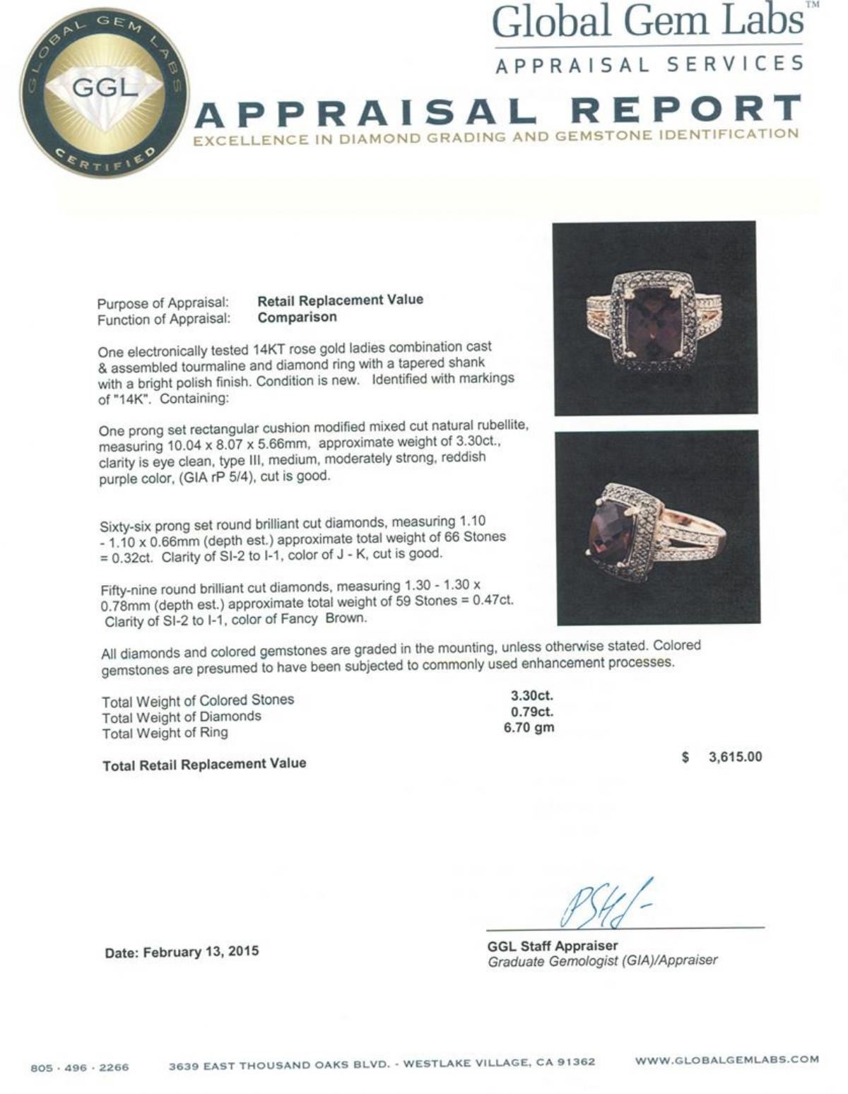 One electronically tested 14KT rose gold ladies combination cast & assembled tourmaline and diamond ring with a tapered shank with a bright polish finish. Identified with markings of "14K". Condition is new. Containing: One prong set rectangular cushion modified mixed cut natural rubellite, measuring 10.04 x 8.07 x 5.66mm, approximate weight of 3.30ct., clarity is eye clean, type III, medium, moderately strong, reddish purple color, (GIA rP 5/4), cut is good. Sixty-Six prong set round brilliant cut diamonds, measuring 1.10 - 1.10 x 0.66mm (depth est.) approximate total weight of 66 Stones = 0.32ct. Clarity: SI-2 to I-1. Color: J - K, Cut is Good. Fifty-Nine round brilliant cut diamonds, measuring 1.30 - 1.30 x 0.78mm (depth est.) approximate total weight of 59 Stones = 0.47ct. Clarity: SI-2 to I-1. All diamonds and colored gemstones are graded in the mounting, unless otherwise stated. Colored gemstones are presumed to have been subjected to commonly used enhancement processes. Total Weight of Colored Stones 3.30ct. Total Weight of Diamonds 0.79ct. Total Weight of Ring 6.70 grams. GGL Appraised.