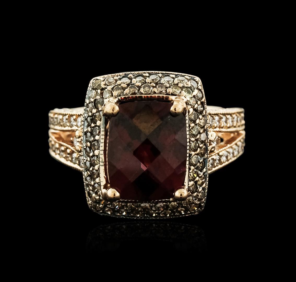 One electronically tested 14KT rose gold ladies combination cast & assembled tourmaline and diamond ring with a tapered shank with a bright polish finish. Identified with markings of "14K". Condition is new. Containing: One prong set rectangular cushion modified mixed cut natural rubellite, measuring 10.04 x 8.07 x 5.66mm, approximate weight of 3.30 ct., clarity is eye clean, type III, medium, moderately strong, reddish purple color, (GIA rP 5/4), cut is good. Sixty-Six prong set round brilliant cut diamonds, measuring 1.10 - 1.10 x 0.66mm (depth est.) approximate total weight of 66 Stones = 0.32ct. Clarity: SI-2 to I-1. Color: J - K, Cut is Good. Fifty-Nine round brilliant cut diamonds, measuring 1.30 - 1.30 x 0.78mm (depth est.) approximate total weight of 59 Stones = 0.47ct. Clarity: SI-2 to I-1. All diamonds and colored gemstones are graded in the mounting, unless otherwise stated. Colored gemstones are presumed to have been subjected to commonly used enhancement processes. Total Weight of Colored Stones 3.30 ct. Total Weight of Diamonds 0.79ct. Total Weight of Ring 6.70 grams. GGL Appraised.