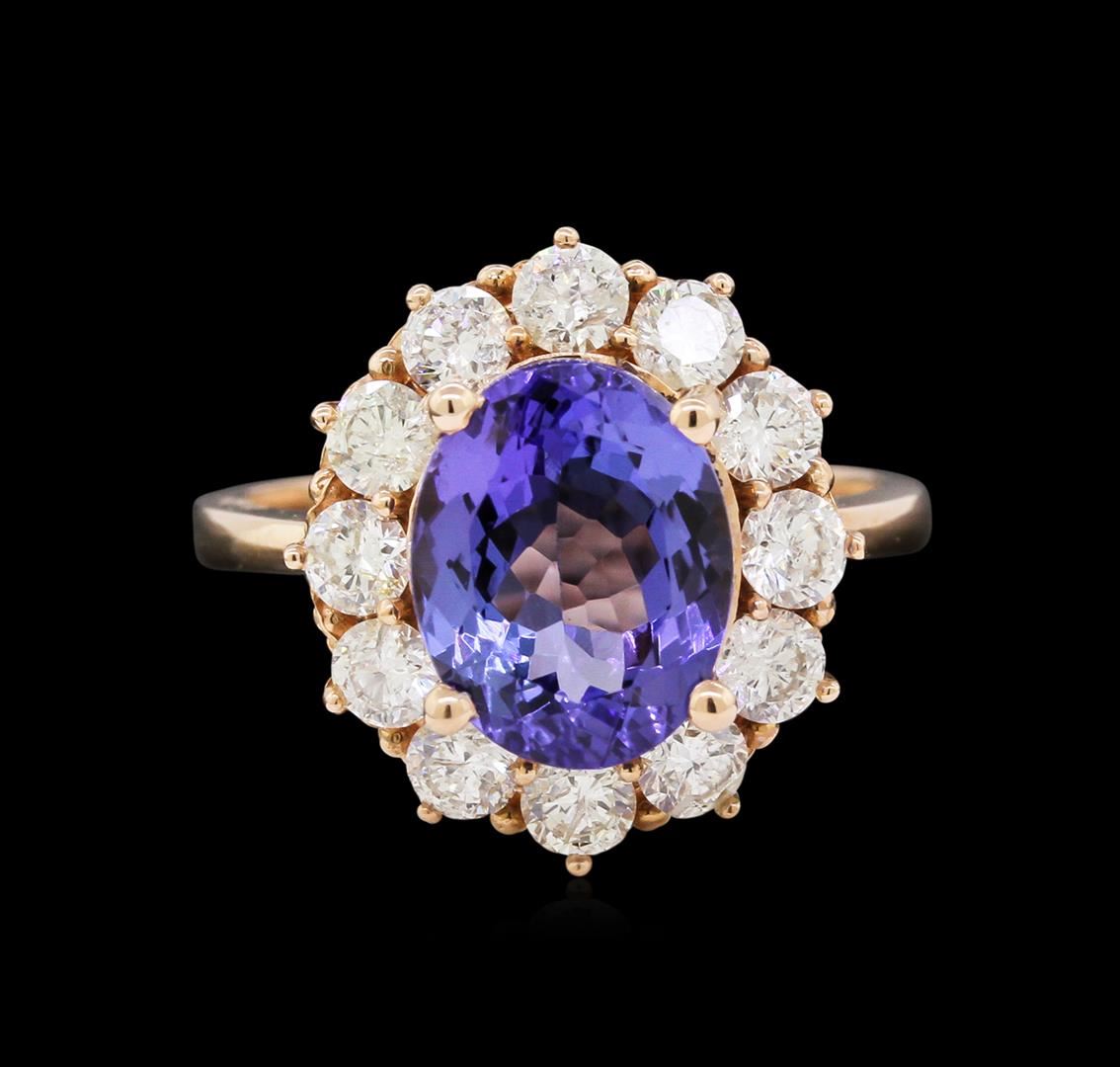 One electronically tested 14KT rose gold ladies combination cast & assembled ring with a bright polish finish. Condition is new. Identified with markings of "K14". Containing: One prong set oval modified brilliant cut natural tanzanite, measuring 10.70 x 8.76 x 5.20mm, approximate weight of 3.30ct., clarity is eye clean, type I, medium, moderately strong, bluish violet color, (GIA bV 5/4), cut is good. Twelve prong set round brilliant cut diamonds, measuring 2.90 - 2.90 x 1.74mm (depth est.) approximate total weight of 12 Stones = 1.07ct. Clarity: SI-2 to I-1. Color: J - K, Cut is Good. Colored gemstones are presumed to have been subjected to commonly used enhancement processes. All diamonds and colored gemstones are graded in the mounting, unless otherwise stated. Total Weight of Colored Stones 3.30ct. Total Weight of Diamonds 1.07ct. Total Weight of Ring 5.40 grams. GGL Appraised at $8,890.00.