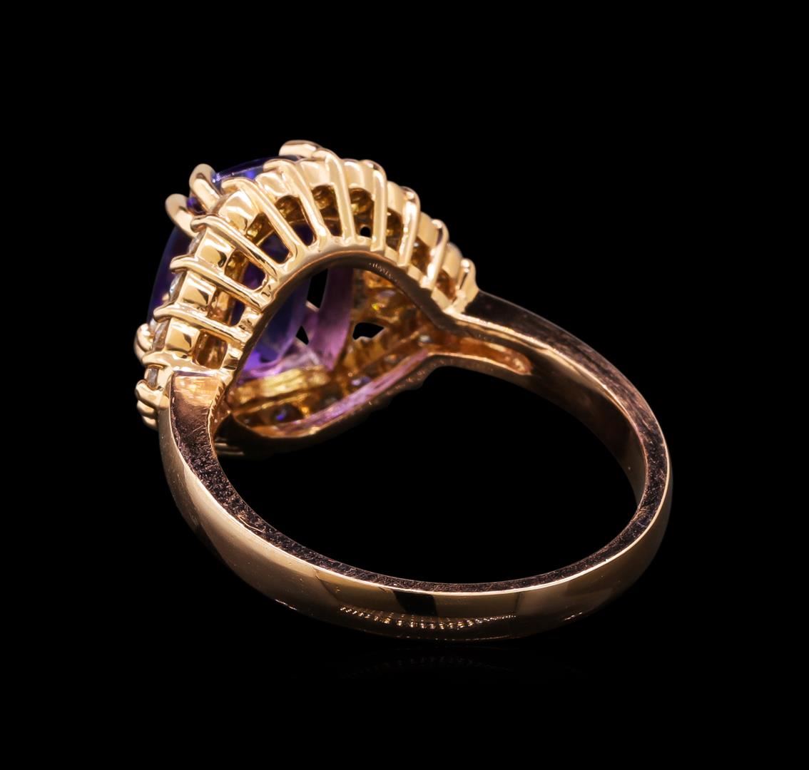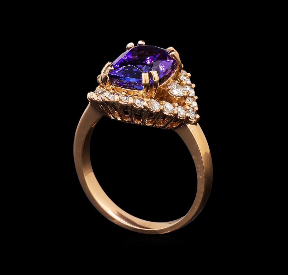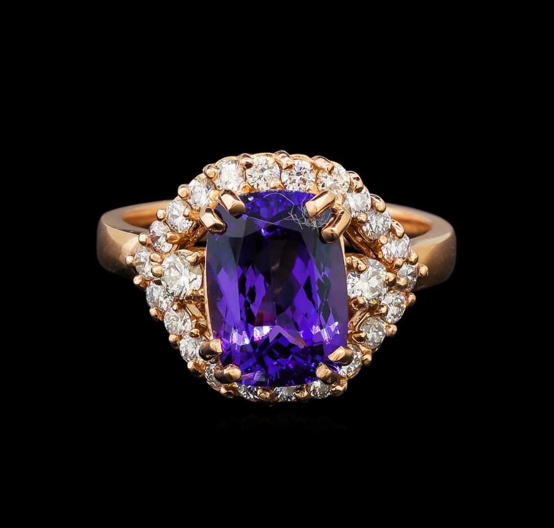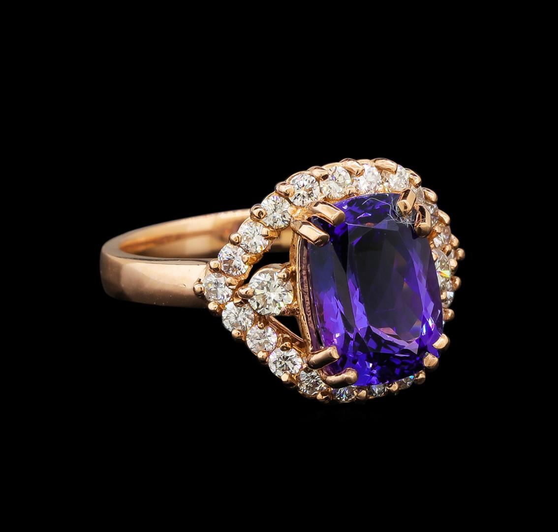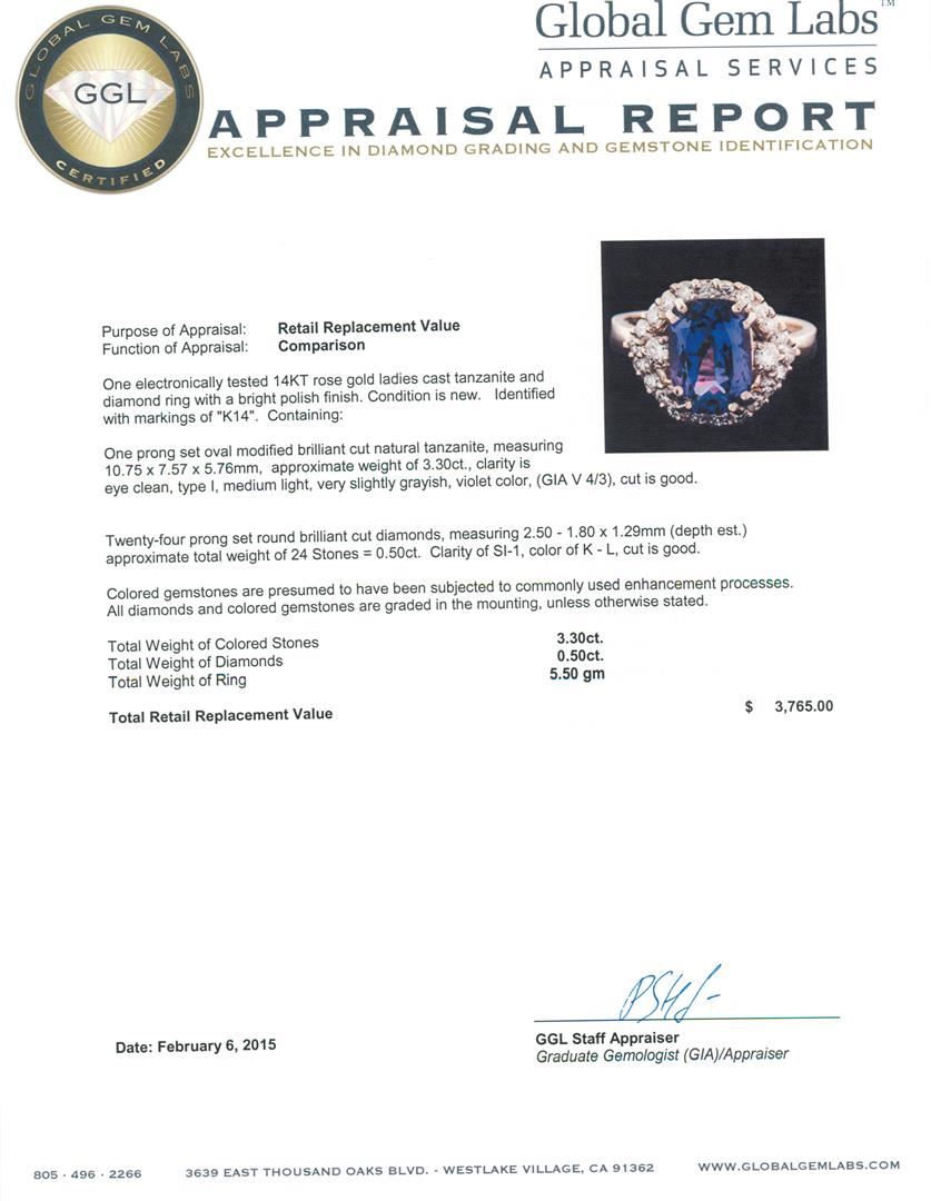 One electronically tested 14KT rose gold ladies cast tanzanite and diamond ring with a bright polish finish. Identified with markings of "K14". Condition is new. Containing: One prong set oval modified brilliant cut natural tanzanite, measuring 10.75 x 7.57 x 5.76mm, approximate weight of 3.30ct., clarity is eye clean, type I, medium light, very slightly grayish, violet color, (GIA V 4/3), cut is good. Twenty-Four prong set round brilliant cut diamonds, measuring 2.50 - 1.80 x 1.29mm (depth est.) approximate. Total Weight of 24 Stones = 0.50ct. Clarity: SI-1. Color: K - L, Cut is Good. Colored gemstones are presumed to have been subjected to commonly used enhancement processes. All diamonds and colored gemstones are graded in the mounting, unless otherwise stated. Total Weight of Colored Stones 3.30ct. Total Weight of Diamonds 0.50ct. Total Weight of Ring 5.50 grams. GGL Appraised at $3,765.00.