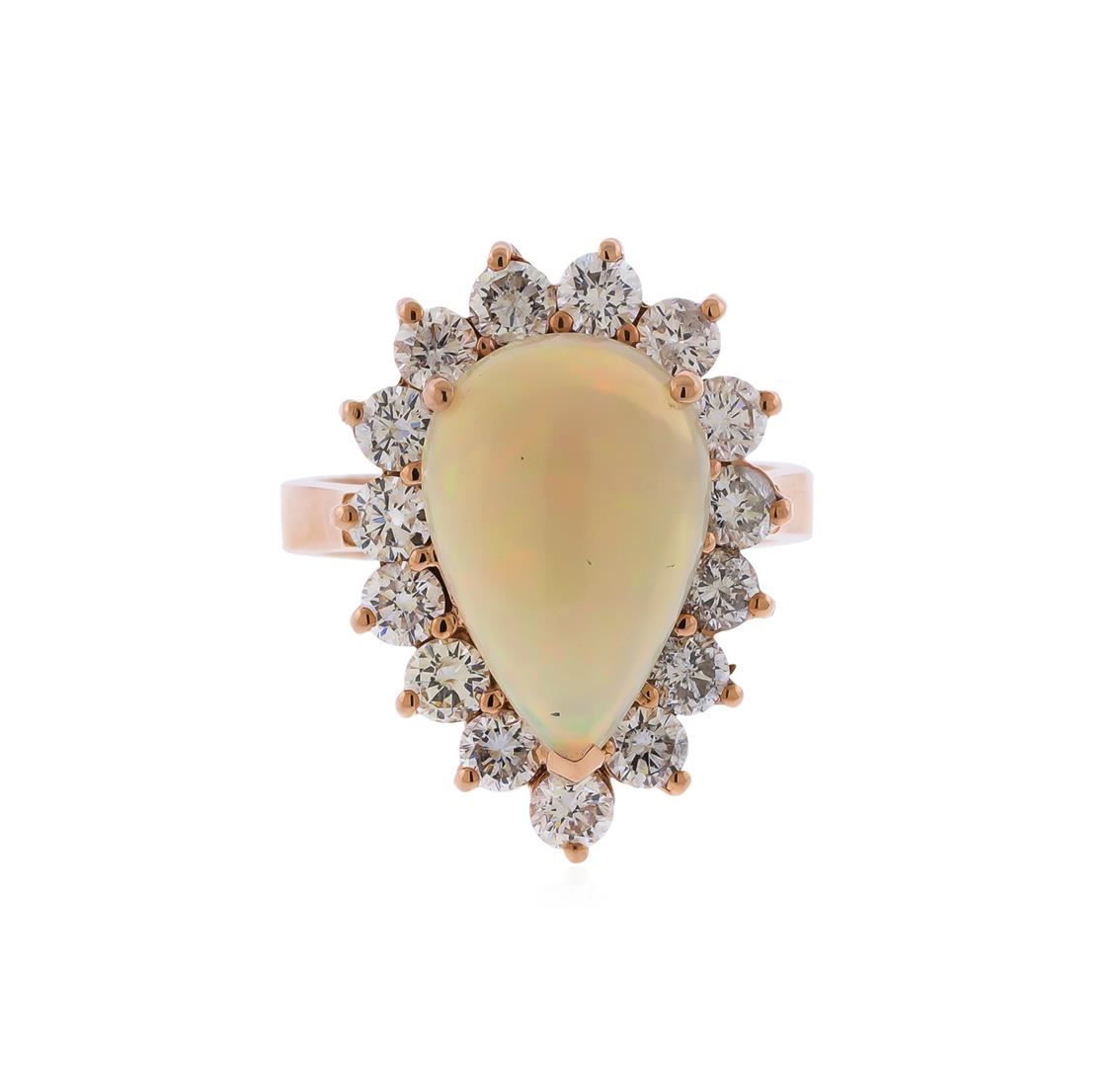 Containing 14KT Rose Gold Ring weighing approximately 6.50 grams. (1) Oval Shaped opal weighing approximately 3.31cts; Surrounded by diamonds weighing approximately 1.68ctw, Clarity: SI Clarity, Color: G-H. RBGS Appraised at $4,400.00.