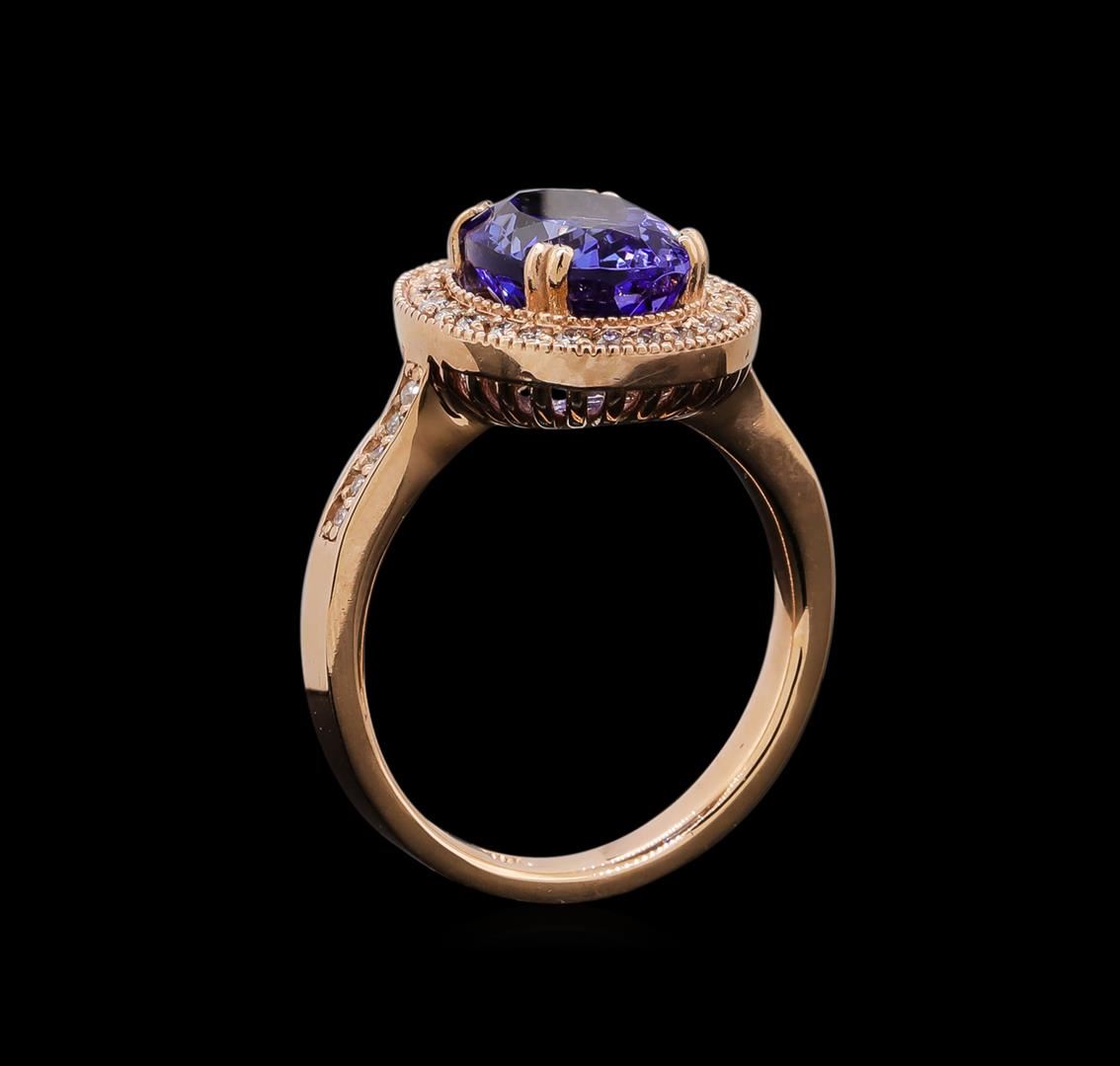 One electronically tested 14KT rose gold ladies cast tanzanite and diamond ring with a bright polish finish. Identified with markings of "14K". Condition is new. Containing: One prong set oval modified brilliant cut natural tanzanite, measuring 10.90 x 8.00 x 5.50mm, approximate weight of 3.37ct., clarity is eye clean, type I, medium, moderately strong, violet color, (GIA V 5/4), cut is good. Thirty-Six prong set round brilliant cut diamonds, measuring 1.00 - 1.00 x 0.60mm (depth est.) approximate total weight of 36 Stones = 0.13ct. Clarity: SI-2 to I-1. Color: I - J, Cut is Good. Colored gemstones are presumed to have been subjected to commonly used enhancement processes. All diamonds and colored gemstones are graded in the mounting, unless otherwise stated. Total Weight of Colored Stones 3.37ct. Total Weight of Diamonds 0.13ct. Total Weight of Ring 5.60 grams. GGL Appraised at $3,310.00.