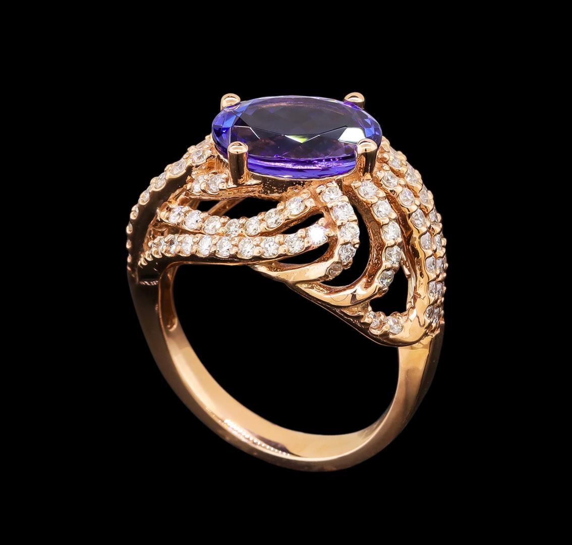 One electronically tested 14KT rose gold ladies cast tanzanite and diamond ring with a bright polish finish. Identified with markings of "K14". Condition is new. Containing: One prong set oval modified brilliant cut natural tanzanite, measuring 11.20 x 8.20 x 5.21mm, approximate weight of 3.37ct., clarity is eye clean, type I, medium light, very slightly grayish, bluish violet color, (GIA bV 4/3), cut is good. Ninety-Five prong set round brilliant cut diamonds, measuring 1.30 - 1.30 x 0.78mm (depth est.) approximate total weight of 95 Stones = 0.76ct. Clarity: SI-2 to I-2. Color: J, Cut is Good. Colored gemstones are presumed to have been subjected to commonly used enhancement processes. All diamonds and colored gemstones are graded in the mounting, unless otherwise stated. Total Weight of Colored Stones 3.37ct. Total Weight of Diamonds 0.76ct. Total Weight of Ring 7.40 grams. GGL Appraised at $5,245.00.