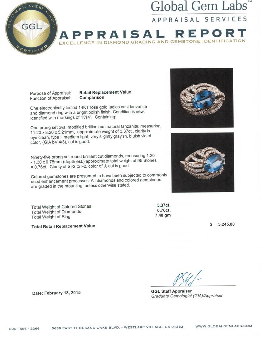 One electronically tested 14KT rose gold ladies cast tanzanite and diamond ring with a bright polish finish. Identified with markings of "K14". Condition is new. Containing: One prong set oval modified brilliant cut natural tanzanite, measuring 11.20 x 8.20 x 5.21mm, approximate weight of 3.37ct., clarity is eye clean, type I, medium light, very slightly grayish, bluish violet color, (GIA bV 4/3), cut is good. Ninety-Five prong set round brilliant cut diamonds, measuring 1.30 - 1.30 x 0.78mm (depth est.) approximate total weight of 95 Stones = 0.76ct. Clarity: SI-2 to I-2. Color: J, Cut is Good. Colored gemstones are presumed to have been subjected to commonly used enhancement processes. All diamonds and colored gemstones are graded in the mounting, unless otherwise stated. Total Weight of Colored Stones 3.37ct. Total Weight of Diamonds 0.76ct. Total Weight of Ring 7.40 grams. GGL Appraised at $5,245.00.
