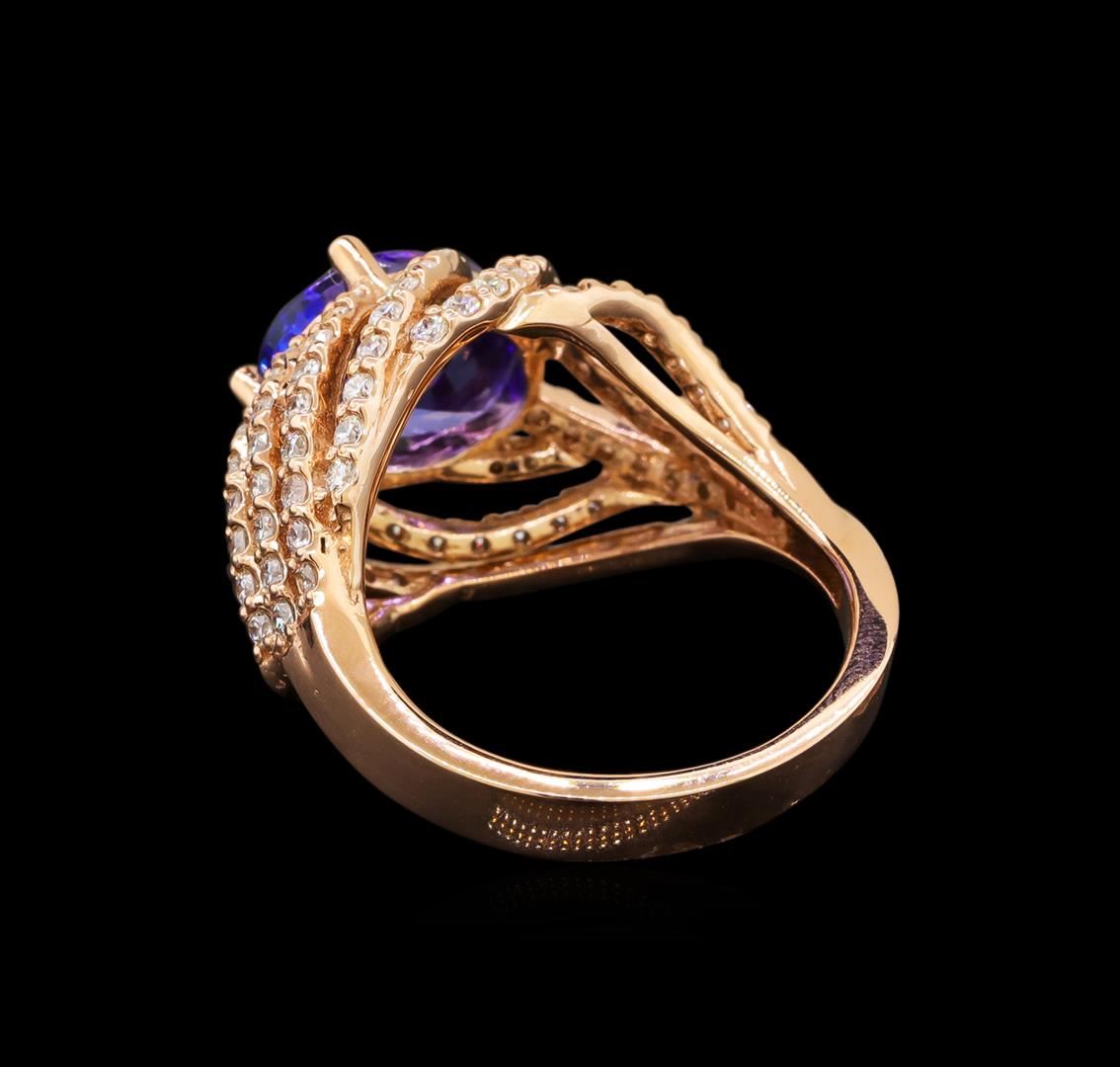 One electronically tested 14KT rose gold ladies cast tanzanite and diamond ring with a bright polish finish. Identified with markings of "K14". Condition is new. Containing: One prong set oval modified brilliant cut natural tanzanite, measuring 11.20 x 8.20 x 5.21mm, approximate weight of 3.37ct., clarity is eye clean, type I, medium light, very slightly grayish, bluish violet color, (GIA bV 4/3), cut is good. Ninety-Five prong set round brilliant cut diamonds, measuring 1.30 - 1.30 x 0.78mm (depth est.) approximate total weight of 95 Stones = 0.76ct. Clarity: SI-2 to I-2. Color: J, Cut is Good. Colored gemstones are presumed to have been subjected to commonly used enhancement processes. All diamonds and colored gemstones are graded in the mounting, unless otherwise stated. Total Weight of Colored Stones 3.37ct. Total Weight of Diamonds 0.76ct. Total Weight of Ring 7.40 grams. GGL Appraised at $5,245.00.
