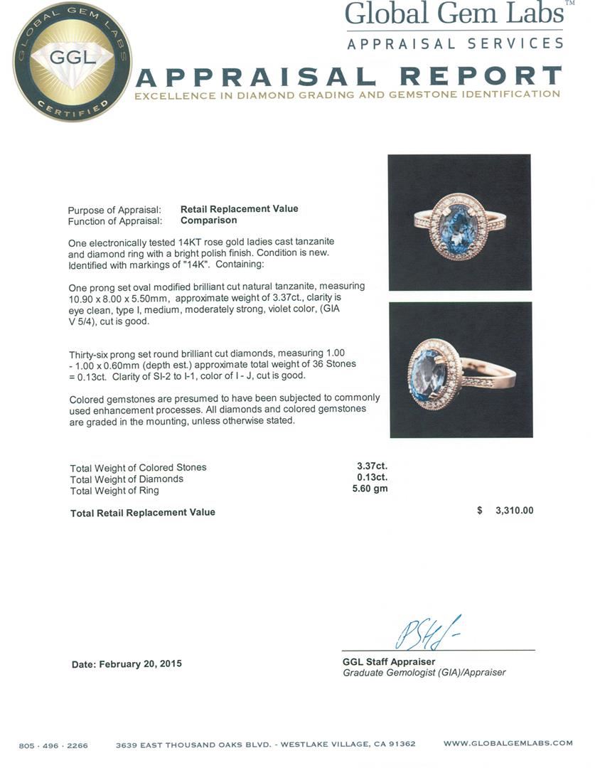 One electronically tested 14KT rose gold ladies cast tanzanite and diamond ring with a bright polish finish. Identified with markings of "14K". Condition is new. Containing: One prong set oval modified brilliant cut natural tanzanite, measuring 10.90 x 8.00 x 5.50mm, approximate weight of 3.37ct., clarity is eye clean, type I, medium, moderately strong, violet color, (GIA V 5/4), cut is good. Thirty-Six prong set round brilliant cut diamonds, measuring 1.00 - 1.00 x 0.60mm (depth est.) approximate total weight of 36 Stones = 0.13ct. Clarity: SI-2 to I-1. Color: I - J, Cut is Good. Colored gemstones are presumed to have been subjected to commonly used enhancement processes. All diamonds and colored gemstones are graded in the mounting, unless otherwise stated. Total Weight of Colored Stones 3.37ct. Total Weight of Diamonds 0.13ct. Total Weight of Ring 5.60 grams. GGL Appraised at $3,310.00.