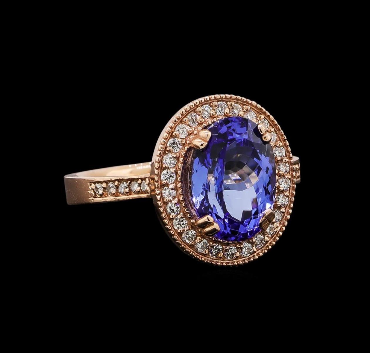 One electronically tested 14KT rose gold ladies cast tanzanite and diamond ring with a bright polish finish. Identified with markings of "14K". Condition is new. Containing: One prong set oval modified brilliant cut natural tanzanite, measuring 10.90 x 8.00 x 5.50mm, approximate weight of 3.37ct., clarity is eye clean, type I, medium, moderately strong, violet color, (GIA V 5/4), cut is good. Thirty-Six prong set round brilliant cut diamonds, measuring 1.00 - 1.00 x 0.60mm (depth est.) approximate total weight of 36 Stones = 0.13ct. Clarity: SI-2 to I-1. Color: I - J, Cut is Good. Colored gemstones are presumed to have been subjected to commonly used enhancement processes. All diamonds and colored gemstones are graded in the mounting, unless otherwise stated. Total Weight of Colored Stones 3.37ct. Total Weight of Diamonds 0.13ct. Total Weight of Ring 5.60 grams. GGL Appraised at $3,310.00.