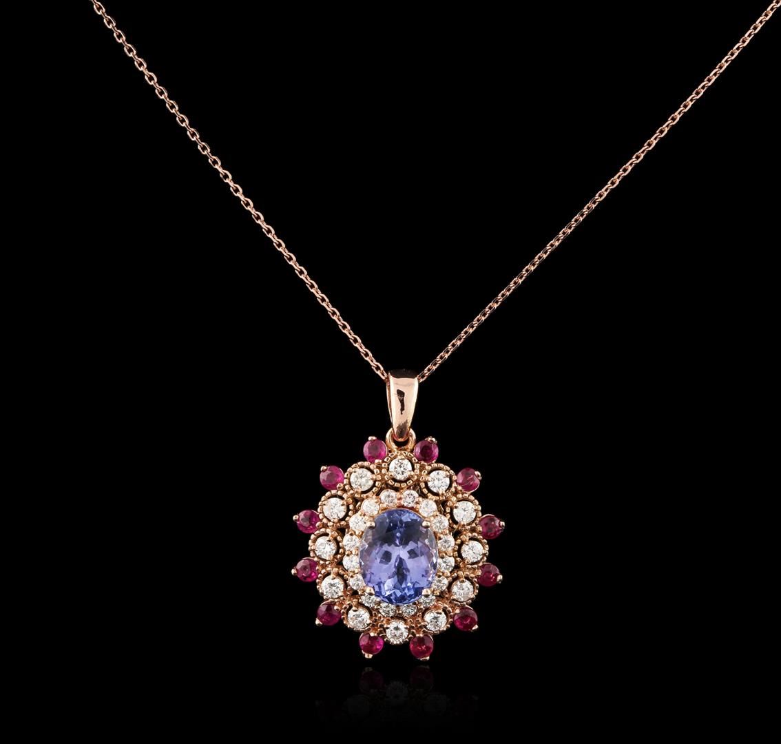 One electronically tested 14KT rose gold ladies cast & assembled tanzanite, ruby and diamond pendant with chain. The pendant features a tanzanite set within a stylized ruby and diamond floret, completed by a rose gold bail. The pendant is supported by an eighteen inch length 14KT rose gold designer style chain, terminating in a lobster claw clasp. Bright polish finish with milgrain detailing. Identified with markings of "14K". Condition is new, good workmanship. Containing: One prong set oval mixed cut natural tanzanite, measuring 9.85 x 7.96 x 6.05mm, 6% bulge factor, approximate weight of 3.41ct., clarity is eye clean, type I, medium dark, very slightly grayish, bluish violet color, (GIA bV 6/3), cut is good. Transmitting light with no distortion, transparent. Graded in the setting. Tanzanite is a very rare gemstone that is only found in the country of Tanzania. Originally discovered in 1967. Tiffany & Company, named the stone Tanzanite. It is found in the Usumburu Mountains that border the Umba Valley of northern Tanzania. Tanzanite occurs in gray, brown, violet, blue, reddish-purple, & green. The gem is interesting because of its exceptional pleochroism. Rotated in different directions a tanzanite will exhibit multiple changes of color. Tanzanite has a low tolerance to ultrasonic cleaning, and should not be cleaned using this method. Twelve prong set round mixed cut natural rubies, measuring 2.40 - 2.40 x 1.56 mm, approximate total weight of 0.84ct., clarity is slightly included, type II, dark, very slightly brownish, red color, (GIA R 7/3), cut is good. Transmitting light with a minimum of distortion, transparent. Naturally occurring internal & external characteristics are present. Color grade is an average for the group. Graded in the setting. Twenty-Eight prong set round brilliant cut diamonds, measuring 2.10 - 1.80 x 1.17mm (depth est.) approximate total weight of 28 Stones = 0.76ct. Graded in the setting. Clarity: SI-1 to I-1. Color: G - I. Total Weight of Colored Stones 4.25ct. Total Weight of Diamonds 0.76ct. Total Weight of Pendant With Chain 6.41 grams. AIG Appraised at $11,945.00.