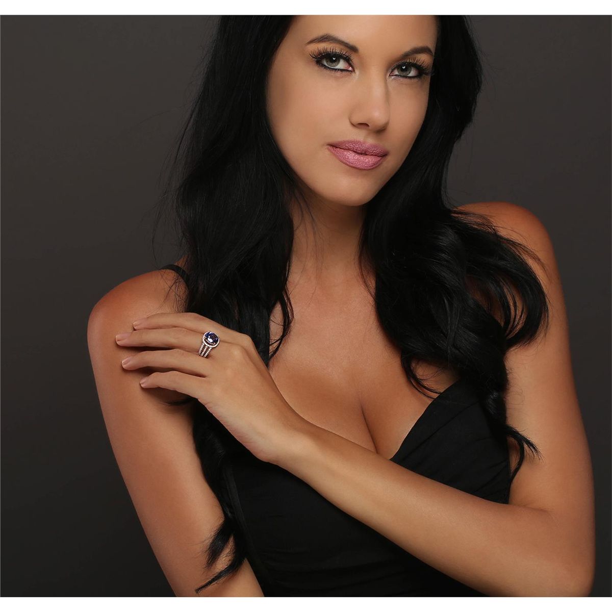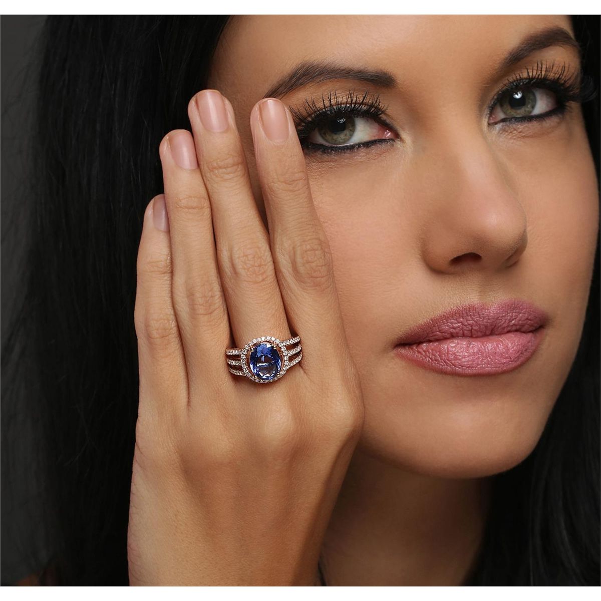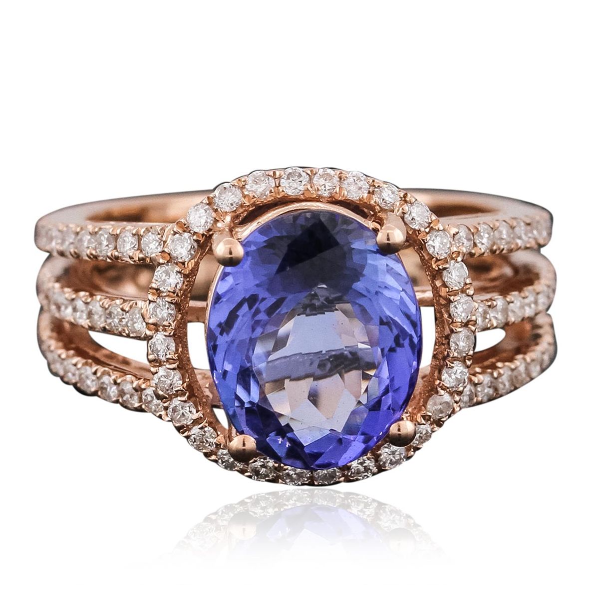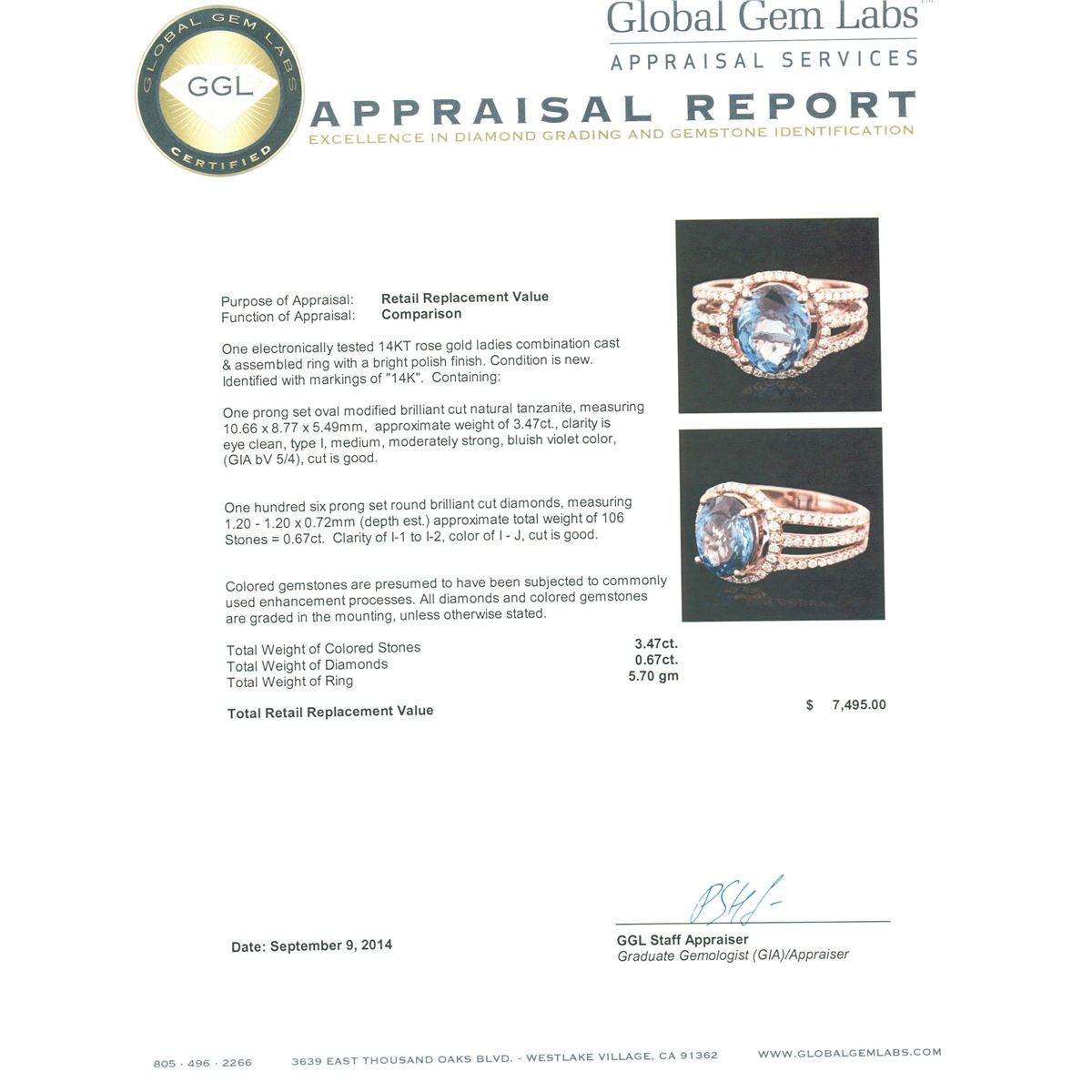 One electronically tested 14KT rose gold ladies combination cast & assembled ring with a bright polish finish. Identified with markings of "14K". Condition is new. Containing: One prong set oval modified brilliant cut natural tanzanite, measuring 10.66 x 8.77 x 5.49mm, approximate weight of 3.47ct., clarity is eye clean, type I, medium, moderately strong, bluish violet color, (GIA bV 5/4), cut is good. One Hundred Six prong set round brilliant cut diamonds, measuring 1.20 - 1.20 x 0.72mm (depth est.) approximate total weight of 106 Stones = 0.67ct. Clarity: I-1 to I-2. Color: I - J, Cut is Good. Colored gemstones are presumed to have been subjected to commonly used enhancement processes. All diamonds and colored gemstones are graded in the mounting, unless otherwise stated. Total Weight of Colored Stones 3.47ct. Total Weight of Diamonds 0.67ct. Total Weight of Ring 5.70 grams. GGL Appraised at $7,495.00.