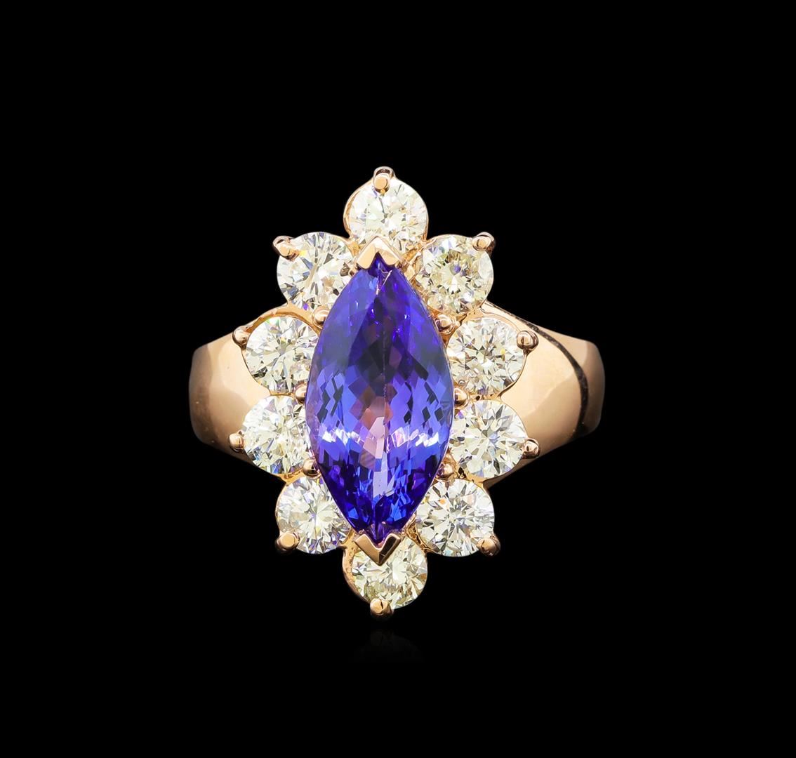 One electronically tested 14KT rose gold ladies cast tanzanite and diamond ring with a bright polish finish. Identified with markings of "K14". Condition is new. Containing: One prong set marquise modified brilliant cut natural tanzanite, measuring 14.00 x 6.50 x 6.00mm, approximate weight of 3.48ct., clarity is eye clean, type I, medium light, moderately strong, bluish violet color, (GIA bV 4/4), cut is good. Ten prong set round brilliant cut diamonds, measuring 3.50 - 3.50 x 2.10mm (depth est.) approximate total weight of 10 Stones = 1.57ct. Clarity: SI-2 to I-1. Color: K - L, Cut is Good. Colored gemstones are presumed to have been subjected to commonly used enhancement processes. All diamonds and colored gemstones are graded in the mounting, unless otherwise stated. Total Weight of Colored Stones 3.48ct. Total Weight of Diamonds 1.57ct. Total Weight of Ring 7.90 grams. GGL Appraised at $6,905.00.