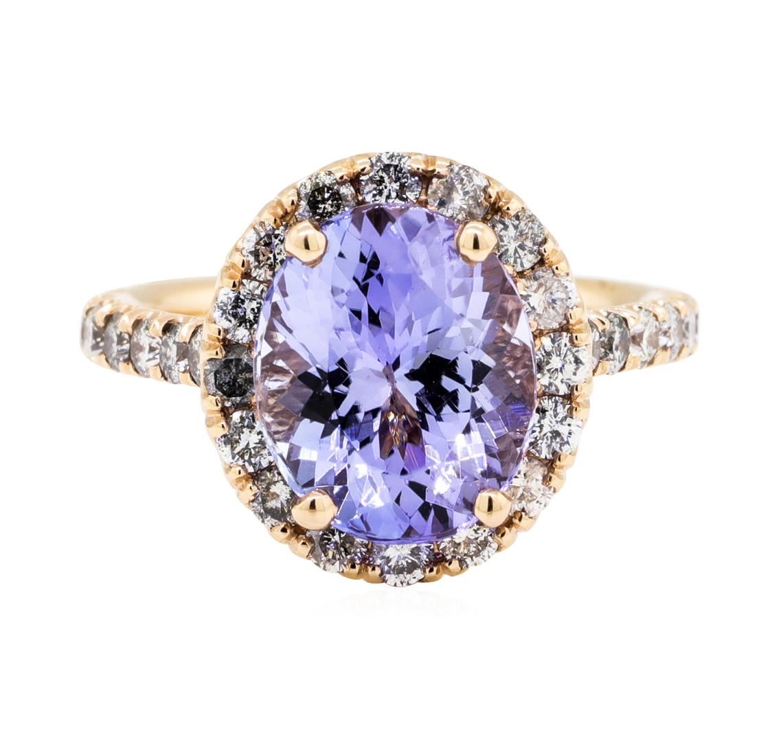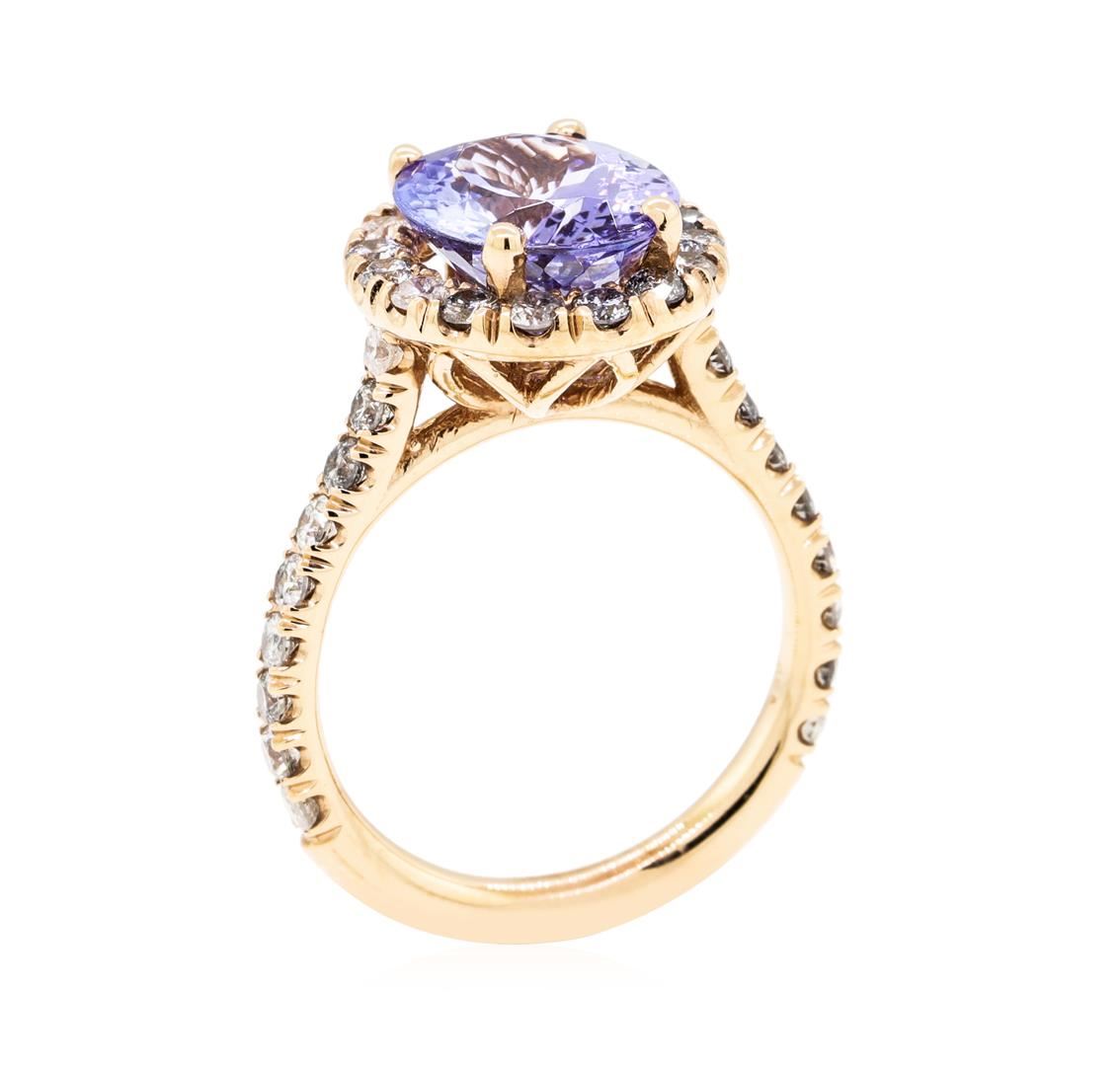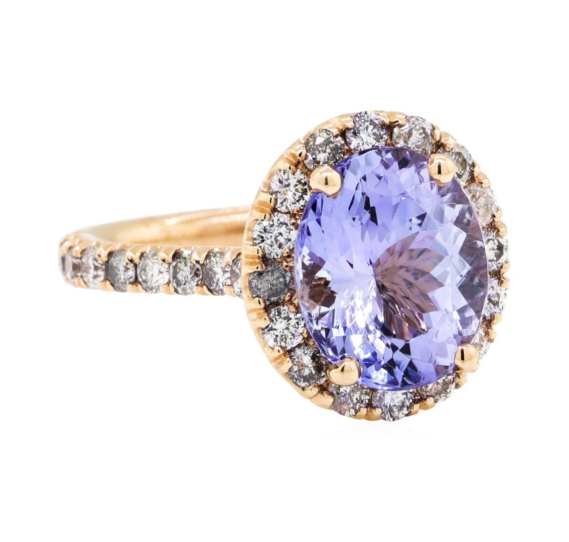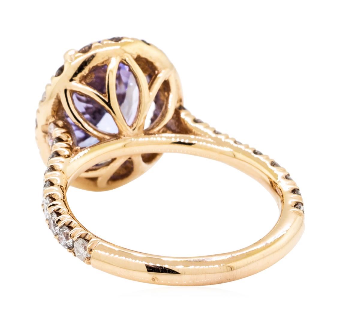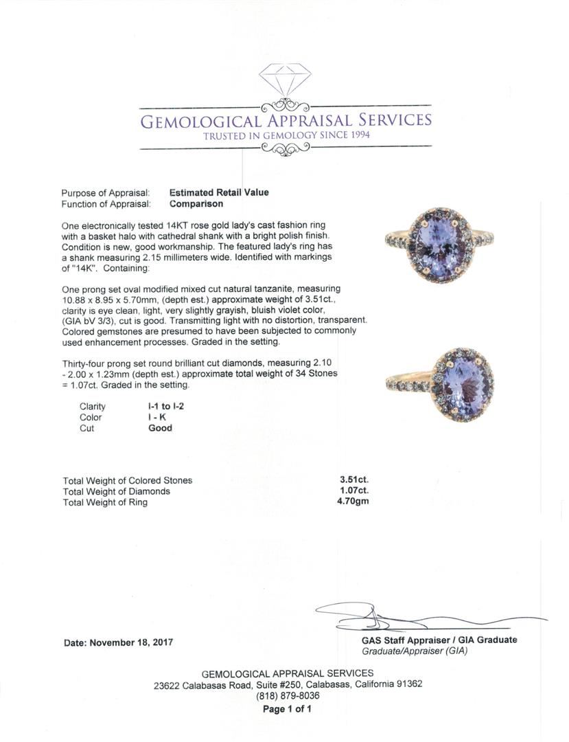 One electronically tested 14KT rose gold lady's cast fashion ring with a basket halo with cathedral shank with a bright polish finish. The featured lady's ring has a shank measuring 2.15 millimeters wide. Identified with markings of '14K'. Condition is new, good workmanship. Containing: One prong set oval modified mixed cut natural tanzanite, measuring 10.88 x 8.95 x 5.70mm, (depth est.) approximate weight of 3.51ct., clarity is eye clean, light, very slightly grayish, bluish violet color, (GIA bV 3/3), cut is good. Transmitting light with no distortion, transparent. Colored gemstones are presumed to have been subjected to commonly used enhancement processes. Graded in the setting. Thirty-Four prong set round brilliant cut diamonds, measuring 2.10 - 2.00 x 1.23mm (depth est.) approximate total weight of 34 Stones = 1.07ct. Graded in the setting. Color I - K Clarity I-1 to I-2 Cut Good. Total Weight of Colored Stones 3.51ct.. Total Weight of Diamonds 1.07ct.. Total Weight of Ring 4.70gm. GAS Appraised.