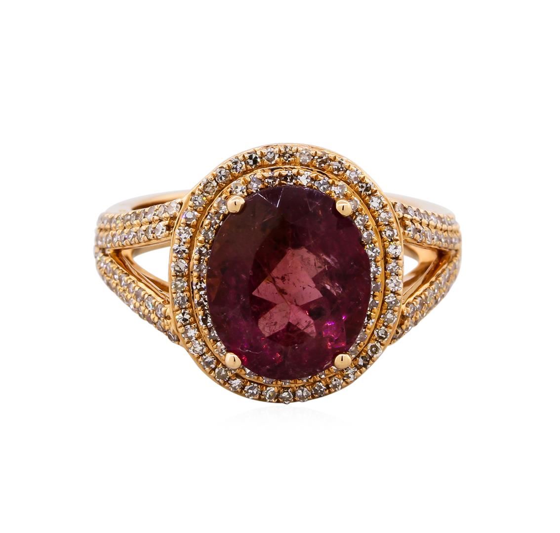Elegant tourmaline and diamond ring set in 14KT rose gold weighing 5.85 grams containing an oval cut 3.61 carat tourmaline center stone showcased by one hundred and seventy-six round diamonds that extend down both sides of the band with a total weight of 0.82cts.
