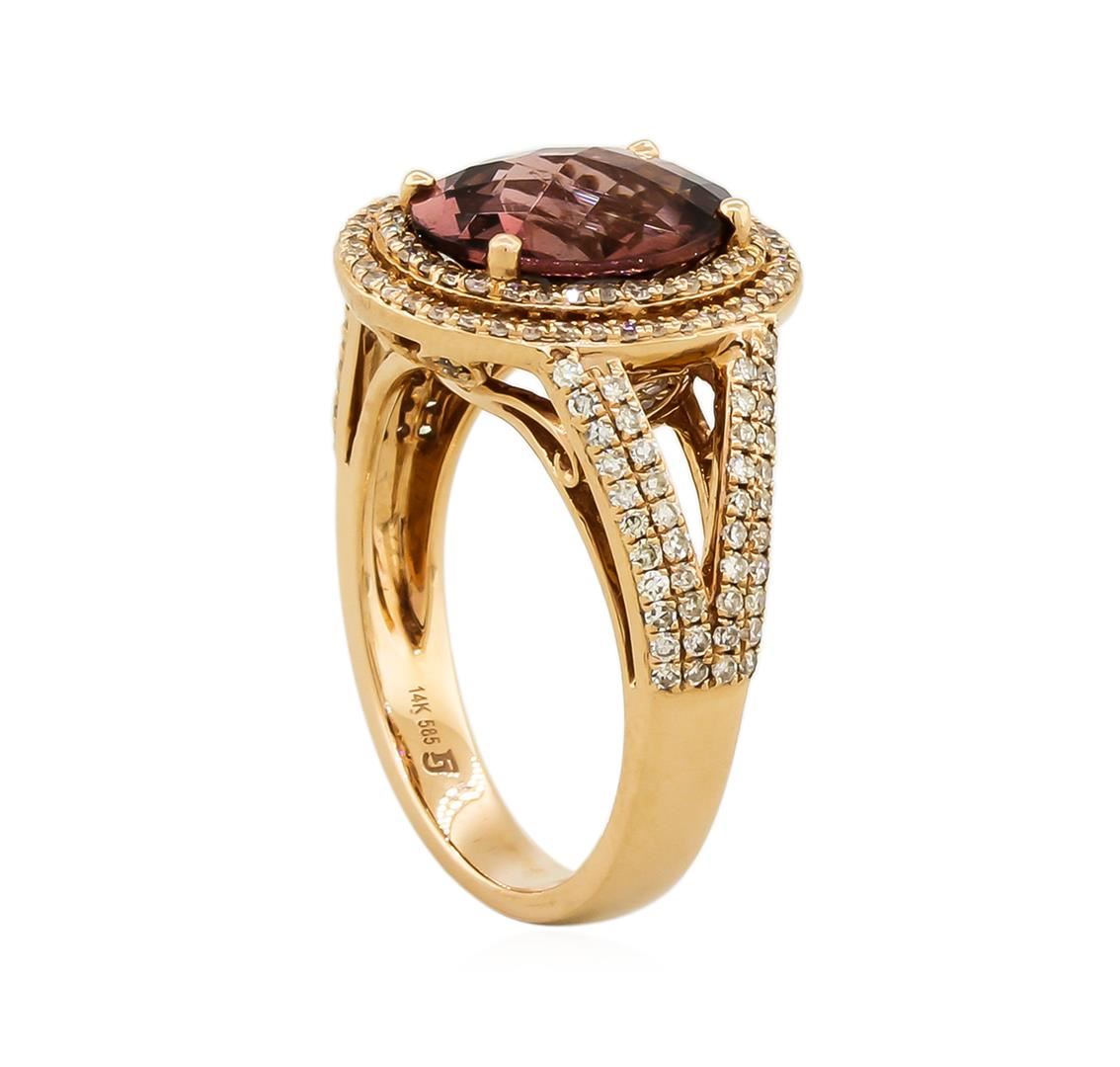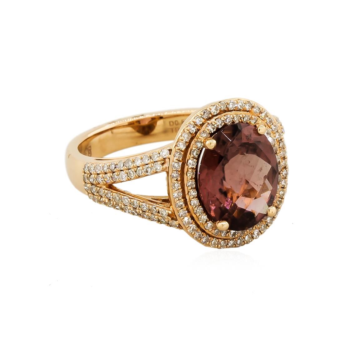 Lovely tourmaline and diamond ring featuring 5.85 grams 14KT Rose Gold and a 3.61 carat oval shaped tourmaline center-stone surrounded by one hundred and seventy-six round diamonds which extend down both sides of the band totaling 0.82 carats.
