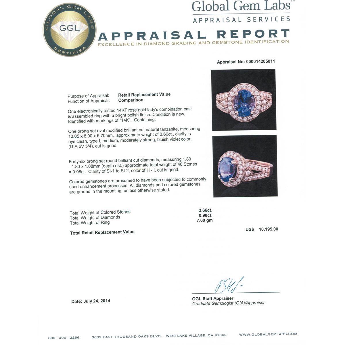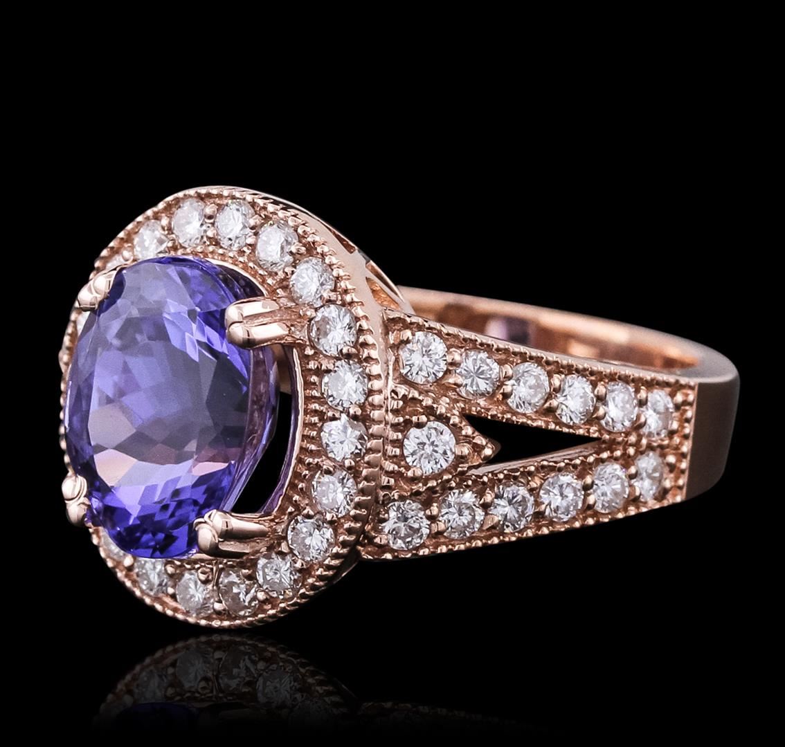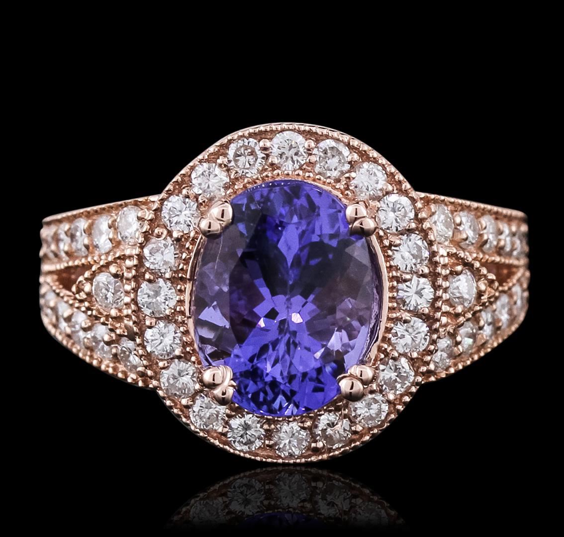 One electronically tested 14KT rose gold ladies combination cast & assembled ring with a bright polish finish. Condition is new. Identified with markings of "14K". Containing: One prong set oval modified brilliant cut natural tanzanite, measuring 10.05 x 8.00 x 6.70mm, approximate weight of 3.66ct., clarity is eye clean, type I, medium, moderately strong, bluish violet color, (GIA bV 5/4), cut is good. Forty-Six prong set round brilliant cut diamonds, measuring 1.80 - 1.80 x 1.08mm (depth est.) approximate total weight of 46 Stones = 0.98ct. Clarity: SI-1 to SI-2. Color: H - I, Cut is Good. Colored gemstones are presumed to have been subjected to commonly used enhancement processes. All diamonds and colored gemstones are graded in the mounting, unless otherwise stated. Total Weight of Colored Stones 3.66ct. Total Weight of Diamonds 0.98ct. Total Weight of Ring 7.60 grams. GGL Appraised at $10,195.00.