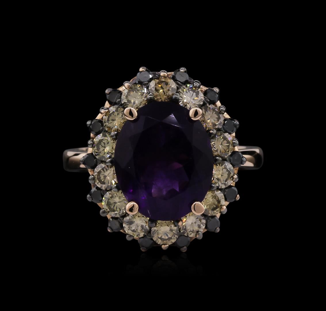 One electronically tested 14KT rose gold ladies cast amethyst and diamond ring. Condition is new, good workmanship. The featured amethyst is set within a tiered diamond bezel, completed by a two and one-half millimeter wide band. Bright and anodized finish. Identified with markings of "14K". Containing: One prong set oval mixed cut natural amethyst, measuring 11.50 x 9.50 x 5.90mm, 5% bulge factor, approximate weight of 3.68ct., clarity is heavily included, type II, medium dark, very slightly grayish, reddish purple color, (GIA rP 6/3), cut is good. Transmitting light with a minimum of distortion, transparent. Naturally occurring internal & external characteristics are present. Graded in the setting. Fourteen prong set round brilliant cut diamonds, measuring 2.80 - 2.70 x 1.65mm (depth est.) approximate total weight of 14 Stones = 1.20ct. Graded in the setting. Clarity SI-1 to I-1. Color Fancy Light Brown Fourteen prong set round brilliant cut diamonds, measuring 1.80 - 1.70 x 1.05mm (depth est.) approximate total weight of 14 Stones = 0.33ct. Indications of multiple laboratory enhancements. Graded in the setting. Clarity Declasse. Color Fancy Black; Irradiated. Total Weight of Colored Stones 3.68ct. Total Weight of Diamonds 1.53ct. Total Weight of Ring 6.89gm. AIG Appraised at $4,420.00.