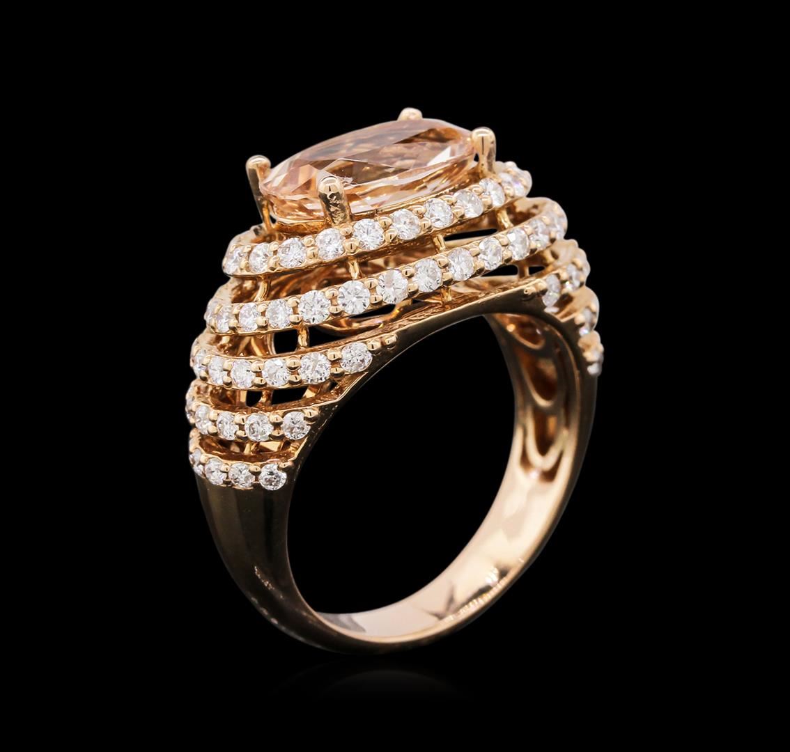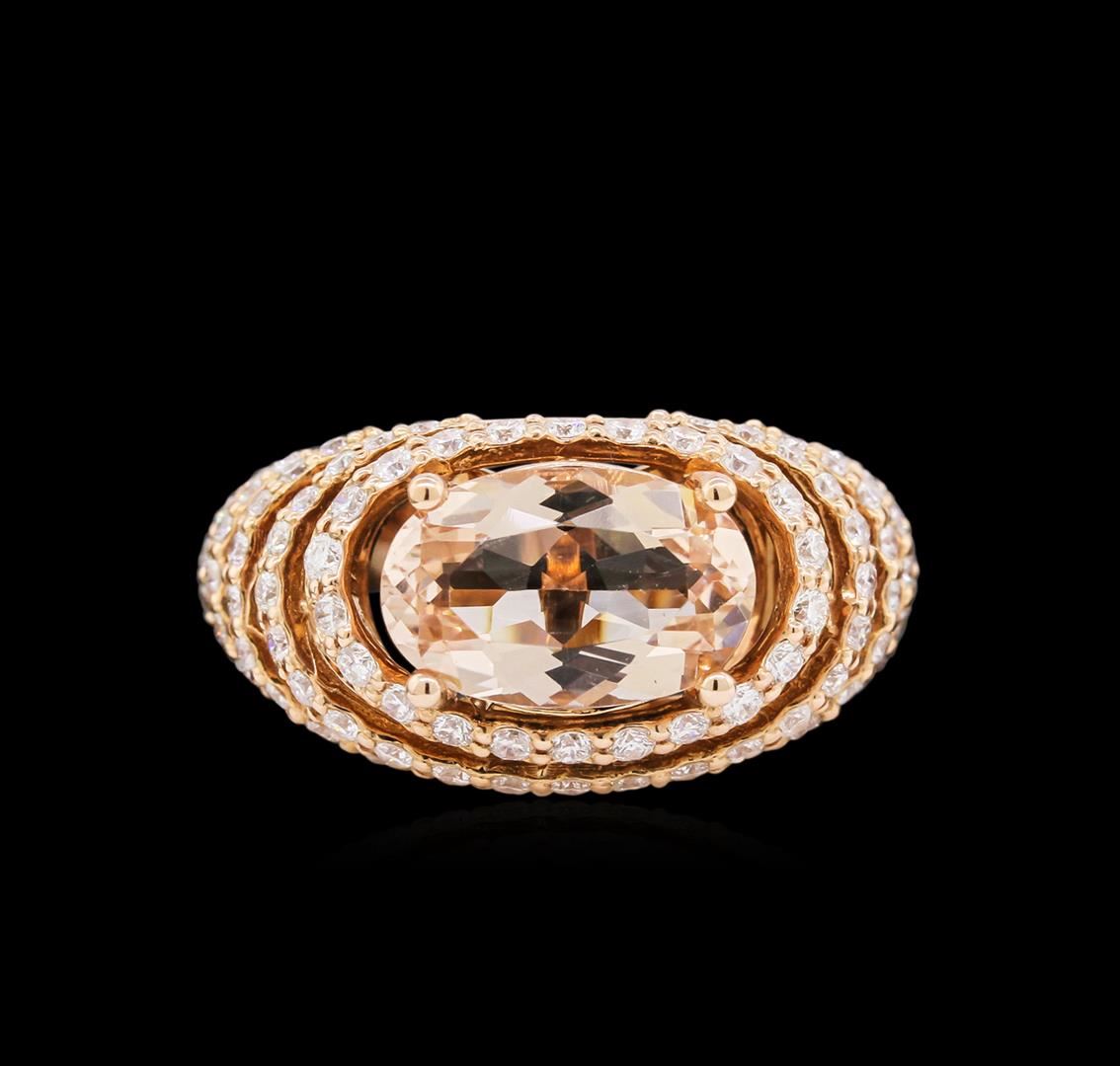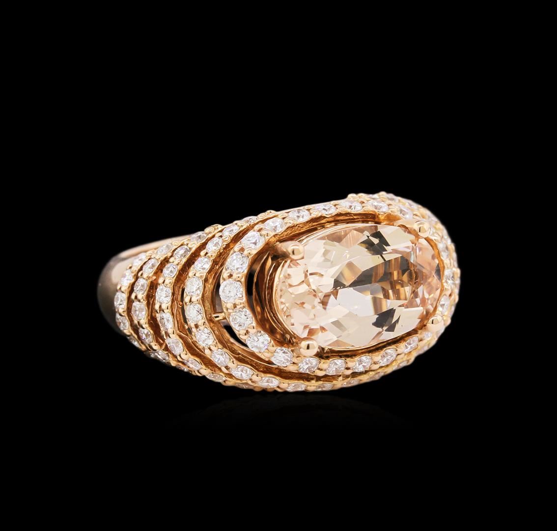 One electronically tested 14KT rose gold ladies cast morganite and diamond ring with a bright polish finish. Condition is new, good workmanship. The featured morganite is set within stacked diamond bezels, completed by a three and one-half millimeter wide band. Identified with markings of "K14". Containing: One prong set oval mixed cut natural morganite, measuring 11.60 x 12.40 x 4.50mm, 6%. bulge factor, approximate weight of 3.74ct., clarity is eye clean, type I, light, very slightly brownish, reddish orange color, (GIA rO 3/3), cut is good. Transmitting light with no distortion, transparent. Graded in the setting. Ninety-One prong set round brilliant cut diamonds, measuring 1.60 - 1.50 x 0.93mm (depth est.) approximate. Total Weight of 91 Stones = 1.33ct. Graded in the setting. Clarity: SI-1 to I-1. Color: G - I. Total Weight of Colored Stones 3.74ct. Total Weight of Diamonds 1.33ct. Total Weight of Ring 7.04 grams. AIG Appraised at $7,890.00.