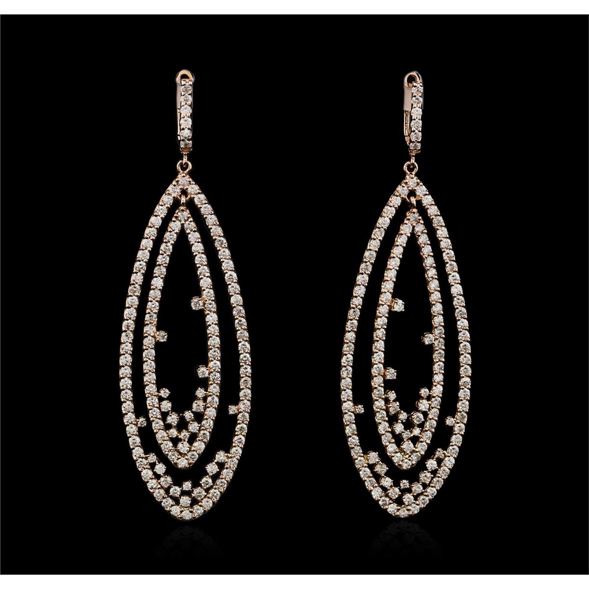 One pair electronically tested 14KT rose gold ladies cast diamond earrings with hinged clip backs with a bright polish finish. Identified with markings of "K14". Condition is new. Containing: Two Hundred Seventy-Six prong set round brilliant cut diamonds, measuring 1.70 - 1.40 x 0.93mm (depth est.) approximate total weight of 276 Stones = 3.75ct. Clarity: I-1 to I-2. Color: J - K, Cut is Good. All diamonds are graded in the mounting, unless otherwise stated. Total Weight of Diamonds 3.75ct. Total Weight of Earrings 16.80 grams. GGL Appraised at $9,700.00.