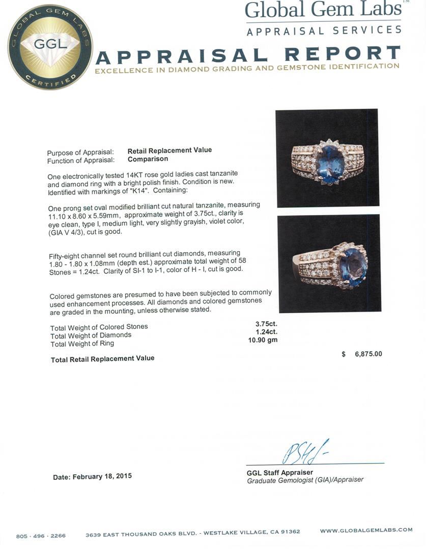 One electronically tested 14KT rose gold ladies cast tanzanite and diamond ring with a bright polish finish. Identified with markings of "K14". Condition is new. Containing: One prong set oval modified brilliant cut natural tanzanite, measuring 11.10 x 8.60 x 5.59mm, approximate weight of 3.75ct., clarity is eye clean, type I, medium light, very slightly grayish, violet color, (GIA V 4/3), cut is good. Fifty-Eight channel set round brilliant cut diamonds, measuring 1.80 - 1.80 x 1.08mm (depth est.) approximate total weight of 58 Stones = 1.24ct. Clarity: SI-1 to I-1. Color: H - I, Cut is Good. Colored gemstones are presumed to have been subjected to commonly used enhancement processes. All diamonds and colored gemstones are graded in the mounting, unless otherwise stated. Total Weight of Colored Stones 3.75ct. Total Weight of Diamonds 1.24ct. Total Weight of Ring 10.90 grams. GGL Appraised at $6,875.00.