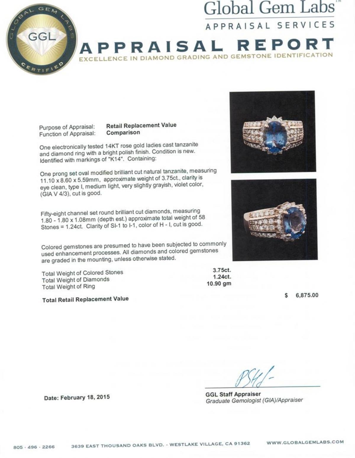 One electronically tested 14KT rose gold ladies cast tanzanite and diamond ring with a bright polish finish. Identified with markings of "K14". Condition is new. Containing: One prong set oval modified brilliant cut natural tanzanite, measuring 11.10 x 8.60 x 5.59mm, approximate weight of 3.75ct., clarity is eye clean, type I, medium light, very slightly grayish, violet color, (GIA V 4/3), cut is good. Fifty-Eight channel set round brilliant cut diamonds, measuring 1.80 - 1.80 x 1.08mm (depth est.) approximate total weight of 58 Stones = 1.24ct. Clarity: SI-1 to I-1. Color: H - I, Cut is Good. Colored gemstones are presumed to have been subjected to commonly used enhancement processes. All diamonds and colored gemstones are graded in the mounting, unless otherwise stated. Total Weight of Colored Stones 3.75ct. Total Weight of Diamonds 1.24ct. Total Weight of Ring 10.90 grams. GGL Appraised.