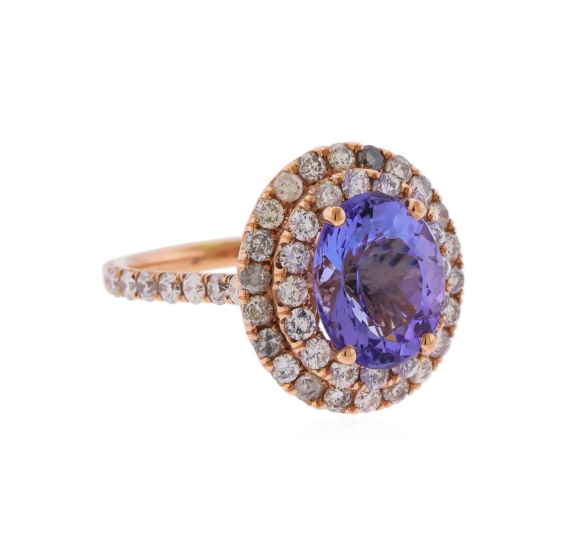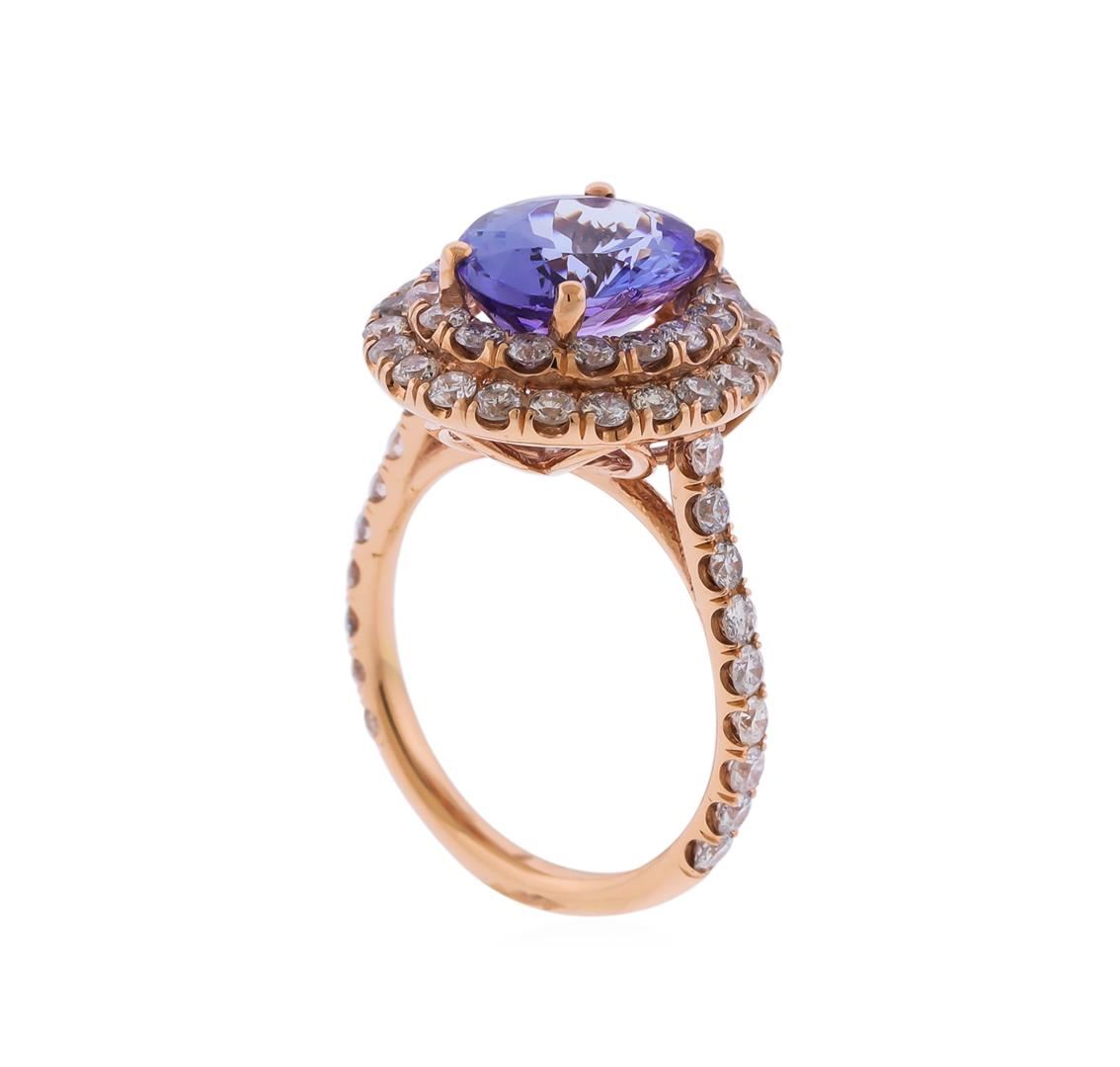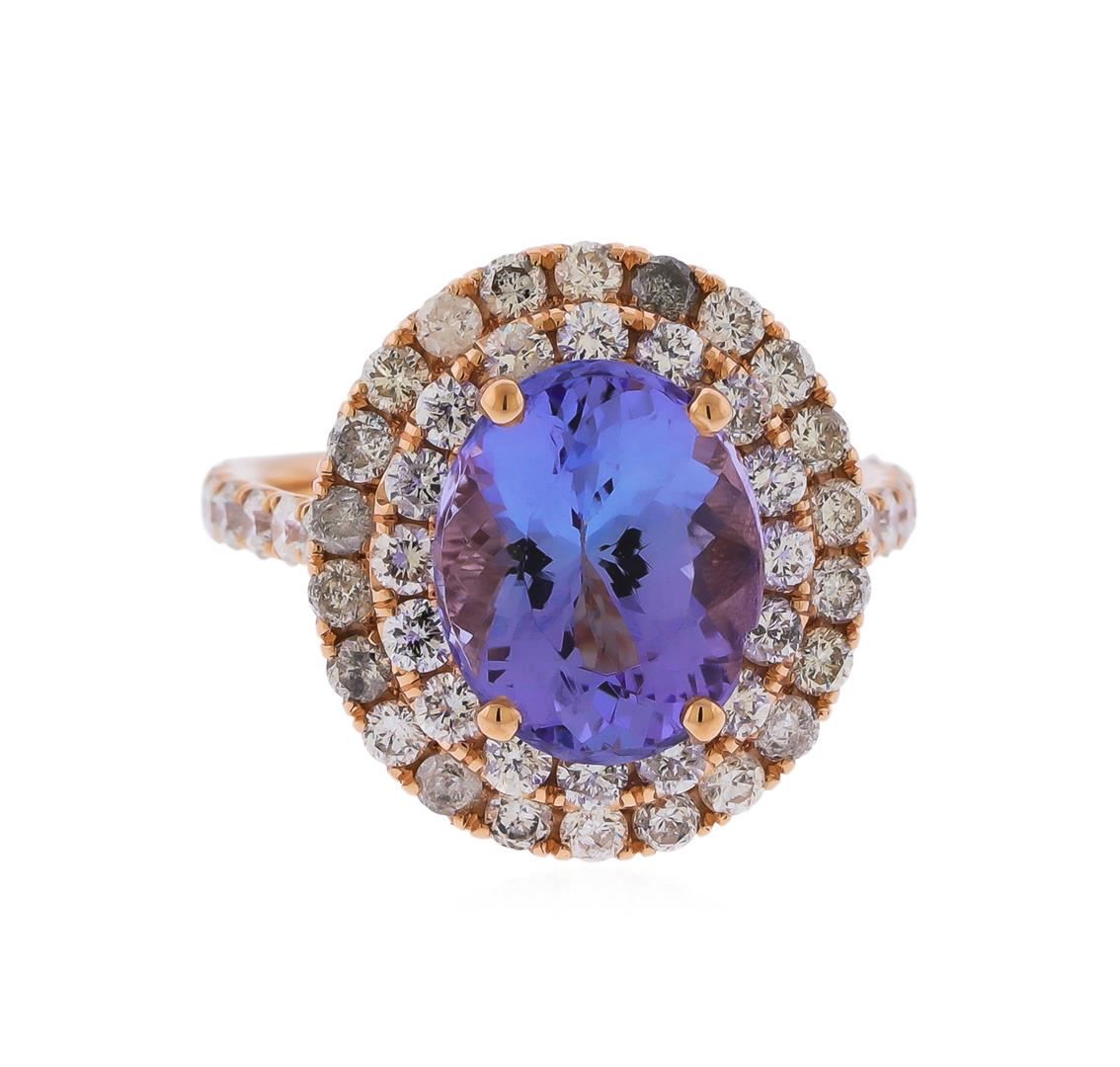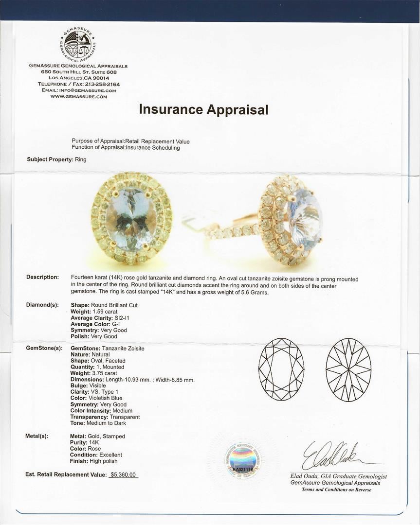 Fourteen karat ( 14K) rose gold tanzanite and diamond ring. An oval cut tanzanite zoisite gemstone, weighing approximately 3.75cts is prong mounted in the center of the ring. Round brilliant cut diamonds, weighing approximately 1.59ctw with an average color of SI-2 to I1 and an average color of G-I, accent the ring around And both sides of the center gemstone. The ring is Cast stamped "14K" and has a gross weight 5.6 Grams. GGA Appraised at $5,360.00.