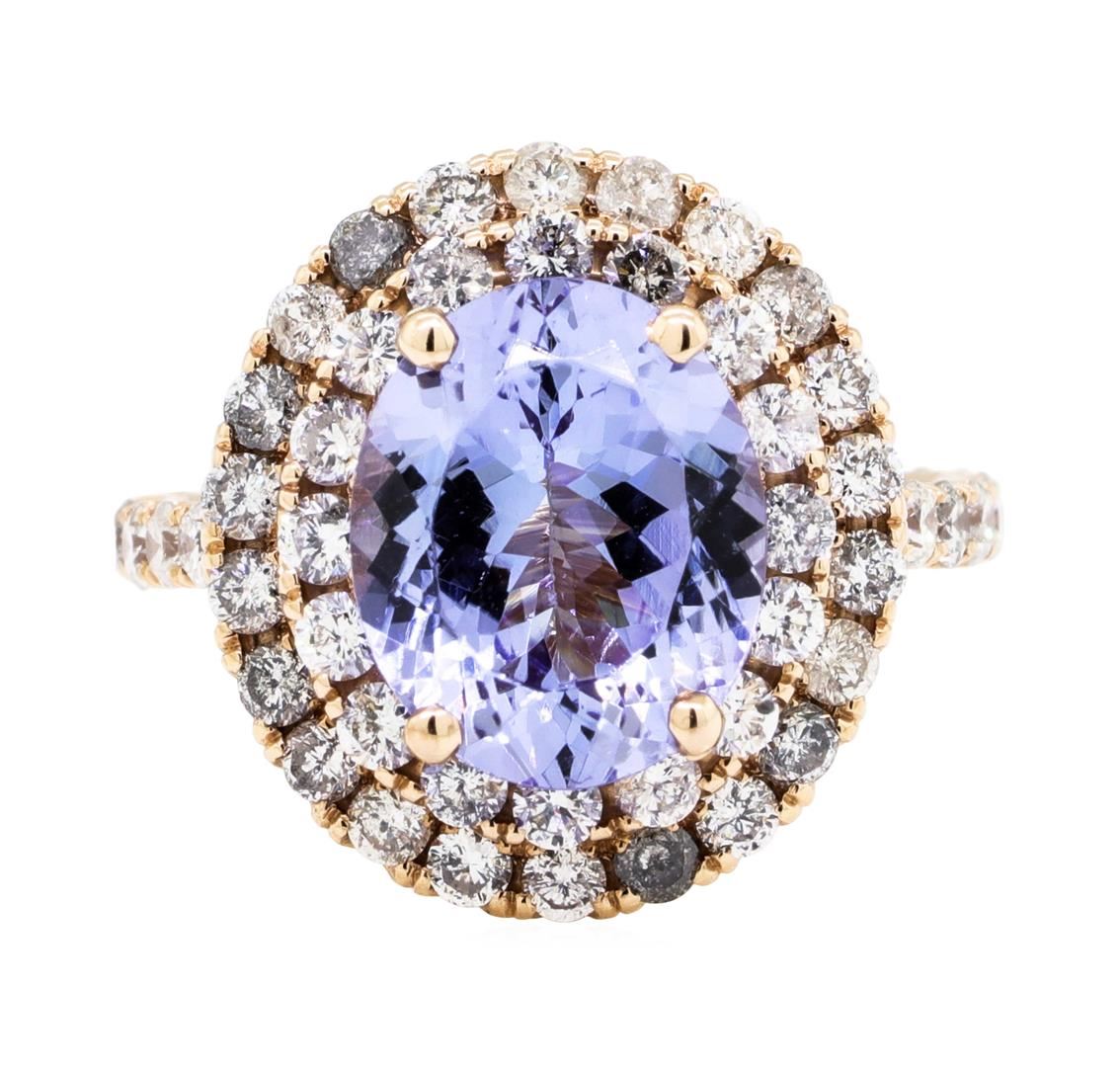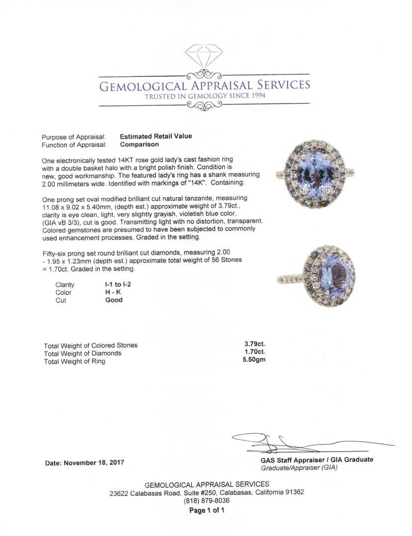 One electronically tested 14KT rose gold lady's cast fashion ring with a double basket halo with a bright polish finish. The featured lady's ring has a shank measuring 2.00 millimeters wide. Identified with markings of '14K'. Condition is new, good workmanship. Containing: One prong set oval modified brilliant cut natural tanzanite, measuring 11.08 x 9.02 x 5.40mm, (depth est.) approximate weight of 3.79ct., clarity is eye clean, light, very slightly grayish, violetish blue color, (GIA vB 3/3), cut is good. Transmitting light with no distortion, transparent. Colored gemstones are presumed to have been subjected to commonly used enhancement processes. Graded in the setting. Fifty-Six prong set round brilliant cut diamonds, measuring 2.00 - 1.95 x 1.23mm (depth est.) approximate total weight of 56 Stones = 1.70ct. Graded in the setting. Color H - K Clarity I-1 to I-2 Cut Good. Total Weight of Colored Stones 3.79ct.. Total Weight of Diamonds 1.70ct.. Total Weight of Ring 5.50gm. GAS Appraised.