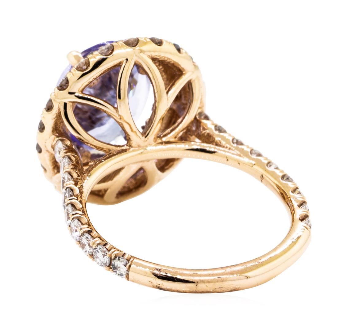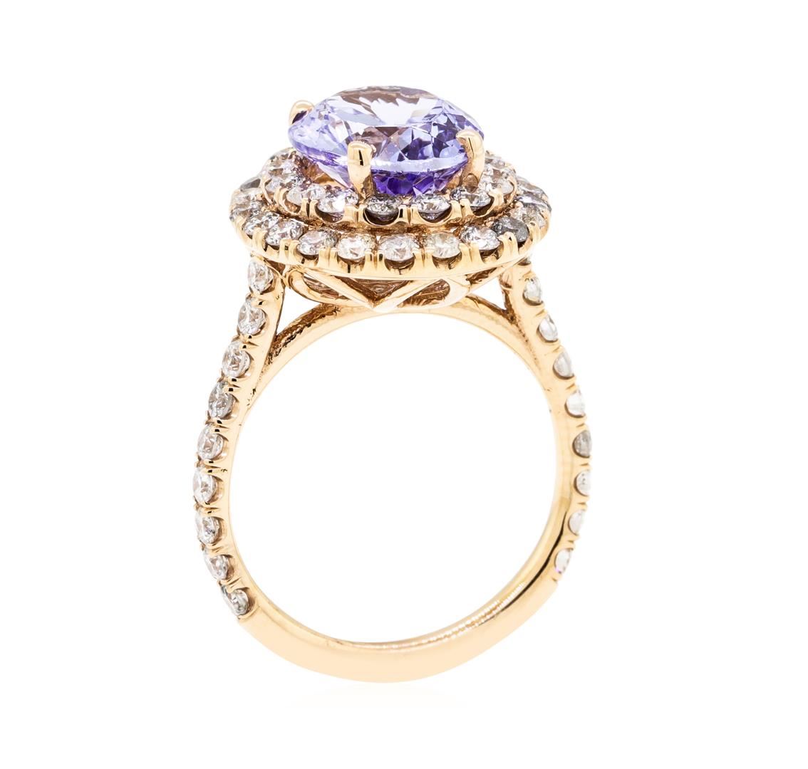 One electronically tested 14KT rose gold lady's cast fashion ring with a double basket halo with a bright polish finish. The featured lady's ring has a shank measuring 2.00 millimeters wide. Identified with markings of '14K'. Condition is new, good workmanship. Containing: One prong set oval modified brilliant cut natural tanzanite, measuring 11.08 x 9.02 x 5.40mm, (depth est.) approximate weight of 3.79ct., clarity is eye clean, light, very slightly grayish, violetish blue color, (GIA vB 3/3), cut is good. Transmitting light with no distortion, transparent. Colored gemstones are presumed to have been subjected to commonly used enhancement processes. Graded in the setting. Fifty-Six prong set round brilliant cut diamonds, measuring 2.00 - 1.95 x 1.23mm (depth est.) approximate total weight of 56 Stones = 1.70ct. Graded in the setting. Color H - K Clarity I-1 to I-2 Cut Good. Total Weight of Colored Stones 3.79ct.. Total Weight of Diamonds 1.70ct.. Total Weight of Ring 5.50gm. GAS Appraised.