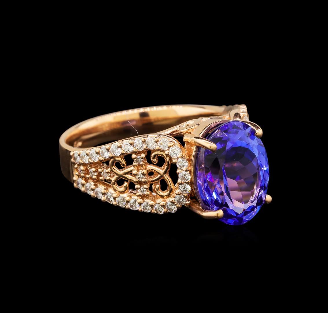 One electronically tested 14KT rose gold ladies cast tanzanite and diamond ring with a bright and brushed finish. Identified with markings of "14K". Condition is new. Containing: One prong set oval modified brilliant cut natural tanzanite, measuring 11.30 x 8.60 x 5.59mm, approximate weight of 3.82ct., clarity is eye clean, type I, medium light, very slightly grayish, violet color, (GIA V 4/3), cut is good. Fifty-Six prong set round brilliant cut diamonds, measuring 1.50 - 1.20 x 0.81mm (depth est.) approximate total weight of 56 Stones = 0.50ct. Clarity: SI-2 to I-2. Color: I - J. Colored gemstones are presumed to have been subjected to commonly used enhancement processes. All diamonds and colored gemstones are graded in the mounting, unless otherwise stated. Total Weight of Colored Stones 3.82ct. Total Weight of Diamonds 0.50ct. Total Weight of Ring 5.90 grams. GGL Appraised at $5,200.00.