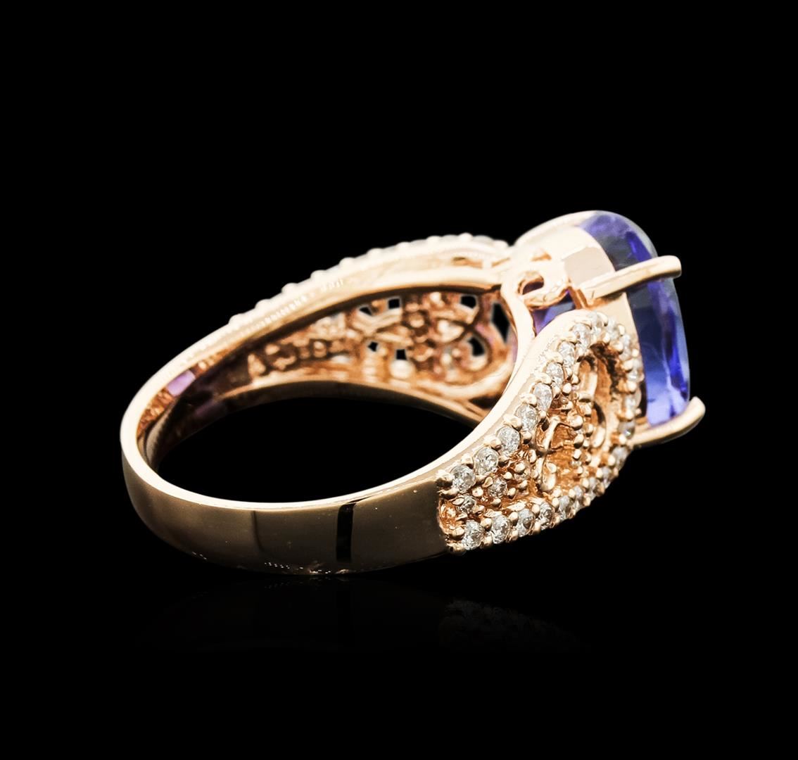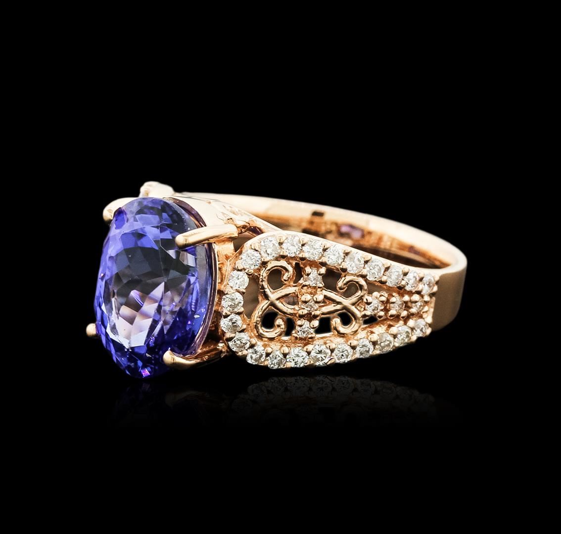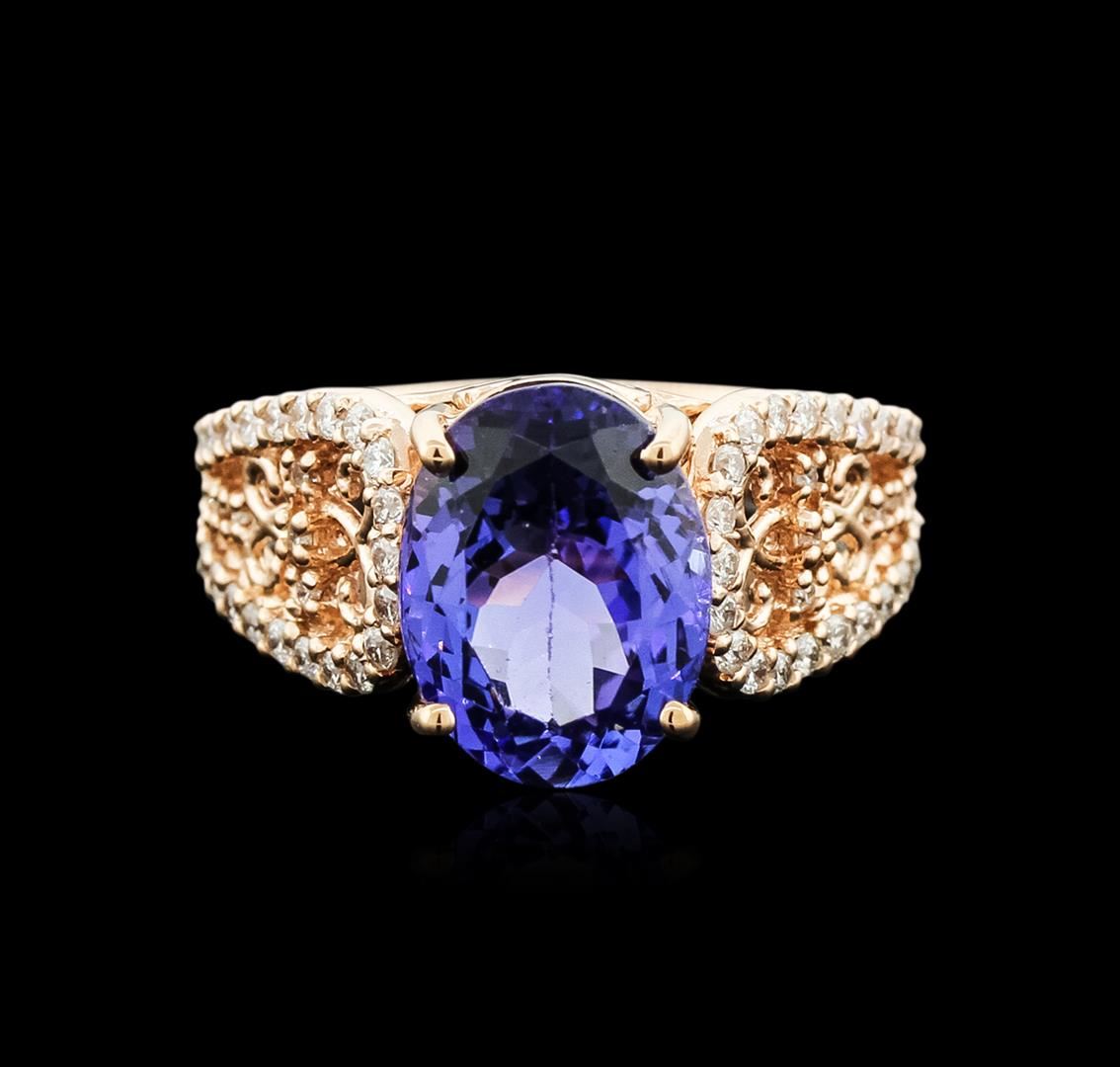 One electronically tested 14KT rose gold ladies cast tanzanite and diamond ring with a bright and brushed finish. Identified with markings of "14K". Condition is new. Containing: One prong set oval modified brilliant cut natural tanzanite, measuring 11.30 x 8.60 x 5.59mm, approximate weight of 3.82ct., clarity is eye clean, type I, medium light, very slightly grayish, violet color, (GIA V 4/3), cut is good. Fifty-Six prong set round brilliant cut diamonds, measuring 1.50 - 1.20 x 0.81mm (depth est.) approximate total weight of 56 Stones = 0.50ct. Clarity: SI-2 to I-2. Color: I - J. Colored gemstones are presumed to have been subjected to commonly used enhancement processes. All diamonds and colored gemstones are graded in the mounting, unless otherwise stated. Total Weight of Colored Stones 3.82ct. Total Weight of Diamonds 0.50ct. Total Weight of Ring 5.90 grams. GGL Appraised at $5,200.00.