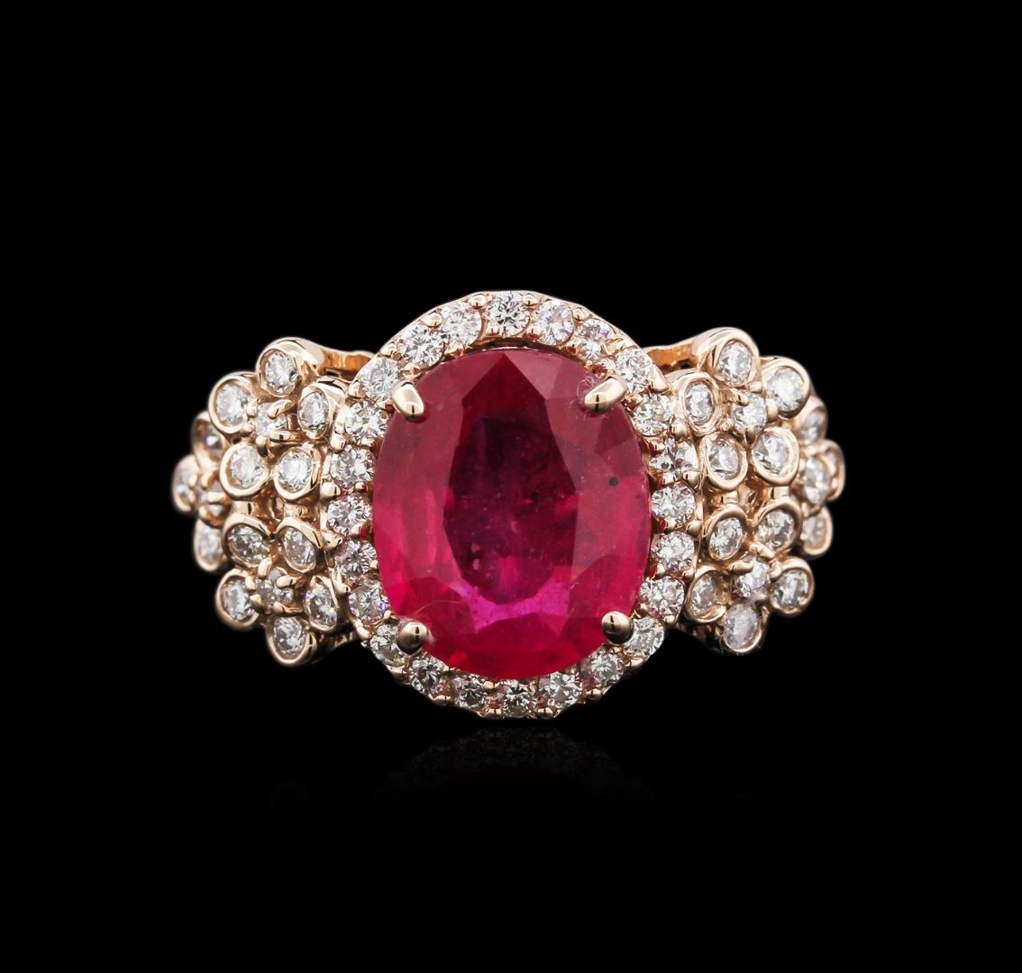One electronically tested 14KT rose gold ladies cast ruby and diamond ring with a bright polish finish. Identified with markings of "14K". Condition is new. Containing: One prong set oval modified brilliant cut natural ruby, measuring 10.70 x 8.80 x 4.28mm, approximate weight of 3.91ct., clarity is heavily included, medium, moderately strong, purple red color, (GIA PR 5/4), cut is good. Sixty bezel set round brilliant cut diamonds, measuring 1.50 - 1.50 x 0.90mm (depth est.) approximate total weight of 60 Stones = 0.82ct. Clarity: I-1 to I-2. Color: H - I, Cut is Good. Colored gemstones are presumed to have been subjected to commonly used enhancement processes. All diamonds and colored gemstones are graded in the mounting, unless otherwise stated. Total Weight of Colored Stones 3.91ct. Total Weight of Diamonds 0.82ct. Total Weight of Ring 6.80 grams. GGL Appraised at $4,005.00.