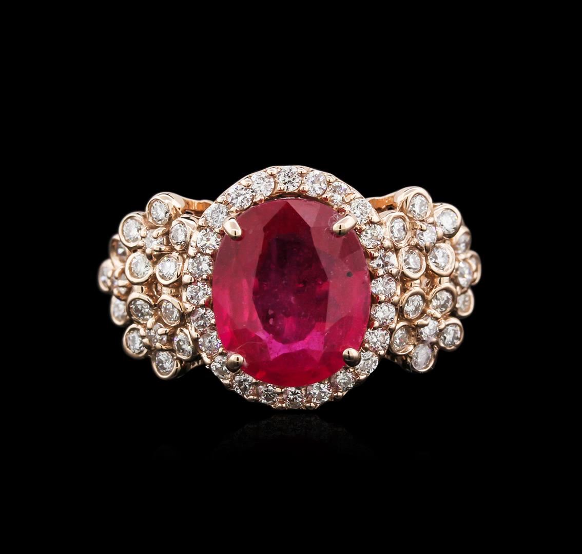 One electronically tested 14KT rose gold ladies cast ruby and diamond ring with a bright polish finish. Identified with markings of "14K". Condition is new. Containing: One prong set oval modified brilliant cut natural ruby, measuring 10.70 x 8.80 x 4.28mm, approximate weight of 3.91ct., clarity is heavily included, medium, moderately strong, purple red color, (GIA PR 5/4), cut is good. Sixty bezel set round brilliant cut diamonds, measuring 1.50 - 1.50 x 0.90mm (depth est.) approximate total weight of 60 Stones = 0.82ct. Clarity: I-1 to I-2. Color: H - I, Cut is Good. Colored gemstones are presumed to have been subjected to commonly used enhancement processes. All diamonds and colored gemstones are graded in the mounting, unless otherwise stated. Total Weight of Colored Stones 3.91ct. Total Weight of Diamonds 0.82ct. Total Weight of Ring 6.80 grams. GGL Appraised at $4,005.00.