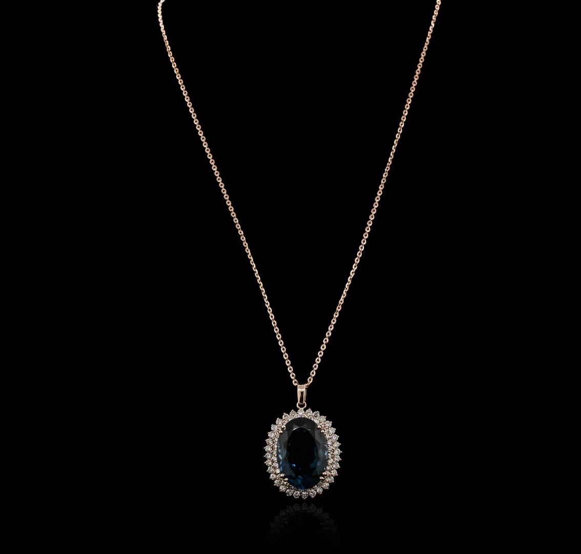 One electronically tested 14KT rose gold ladies cast topaz and diamond pendant & chain 18.0" long, small oval link with a lobster claw clasp with a bright polish finish. Identified with markings of "14K". Condition is new. Containing: One prong set oval modified brilliant cut natural blue topaz, measuring 25.06 x 17.86 x 10.56mm, exact weight 35.04ct., clarity is eye clean, type I, medium, very slightly grayish, greenish blue color, (GIA gB 5/3), cut is good. Sixty-Four prong set round brilliant cut diamonds, measuring 2.40 - 2.00 x 1.32mm (depth est.) approximate total weight of 64 Stones = 2.49ct. Clarity: SI-1 to I-1. Color: L - M, Cut is Good. Colored gemstones are presumed to have been subjected to commonly used enhancement processes. Diamonds and colored gemstones are graded in the mounting, unless otherwise stated. Total Weight of Colored Stones 35.04ct. Total Weight of Diamonds 2.49ct. Total Weight of Pendant & Chain 21.10 grams. GGL Appraised at $5,000.00.