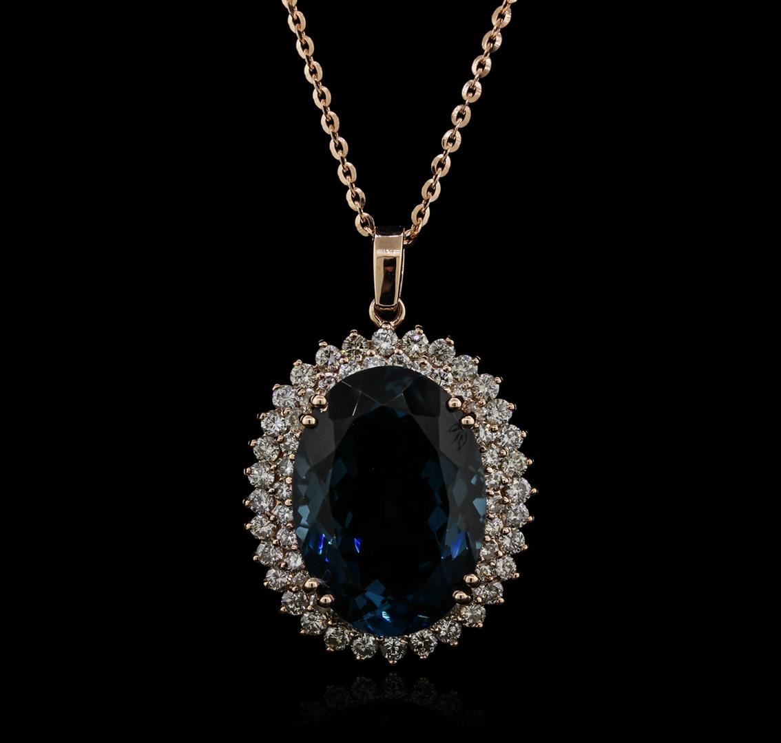 One electronically tested 14KT rose gold ladies cast topaz and diamond pendant & chain 18.0" long, small oval link with a lobster claw clasp with a bright polish finish. Identified with markings of "14K". Condition is new. Containing: One prong set oval modified brilliant cut natural blue topaz, measuring 25.06 x 17.86 x 10.56mm, exact weight 35.04ct., clarity is eye clean, type I, medium, very slightly grayish, greenish blue color, (GIA gB 5/3), cut is good. Sixty-Four prong set round brilliant cut diamonds, measuring 2.40 - 2.00 x 1.32mm (depth est.) approximate total weight of 64 Stones = 2.49ct. Clarity: SI-1 to I-1. Color: L - M, Cut is Good. Colored gemstones are presumed to have been subjected to commonly used enhancement processes. Diamonds and colored gemstones are graded in the mounting, unless otherwise stated. Total Weight of Colored Stones 35.04ct. Total Weight of Diamonds 2.49ct. Total Weight of Pendant & Chain 21.10 grams. GGL Appraised at $5,000.00.