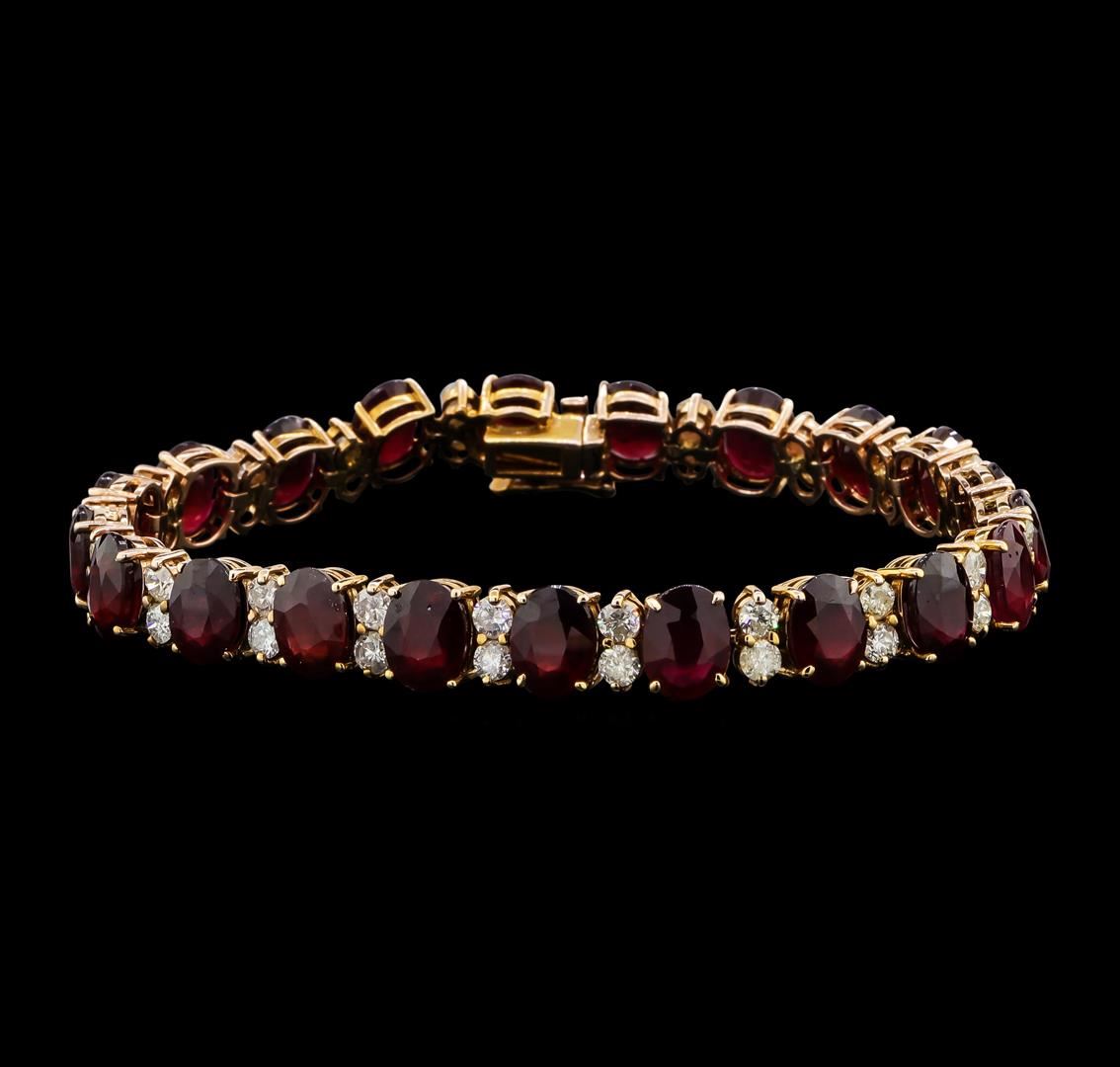 One electronically tested 14KT rose gold lady's combination cast & assembled fashion bracelet with a tongue clasp with foldover safety with a bright polish finish. The featured lady's bracelet measures approximately 7.5 inches in length. Identified with markings of "14K". Condition is new, good workmanship. Containing: Twenty-one prong set oval modified mixed cut natural rubies, measuring 8.08 x 6.15 x 3.90mm, (depth est.) 3%. bulge factor, approximate total weight of 35.18ct., clarity is moderately included, dark, moderately strong, red color, (GIA R 7/4), cut is good. Transmitting light somewhat diffusely, transparent to translucent. Naturally occurring internal & external characteristics are present. Indications of laboratory high temperature heat treatment, with glass & flux additives. Colored gemstones are presumed to have been subjected to commonly used enhancement processes. Graded in the setting. Forty prong set round brilliant cut diamonds, measuring 3.10 - 2.80 x 1.83mm (depth est.) approximate total weight of 40 Stones = 3.90ct. Graded in the setting. Clarity: I-1 to I-2. Color: G - HCut Good. Total Weight of Colored Stones 35.18ct. Total Weight of Diamonds 3.90ct. Total Weight of Bracelet 21.80gm. GAS Appraised.
