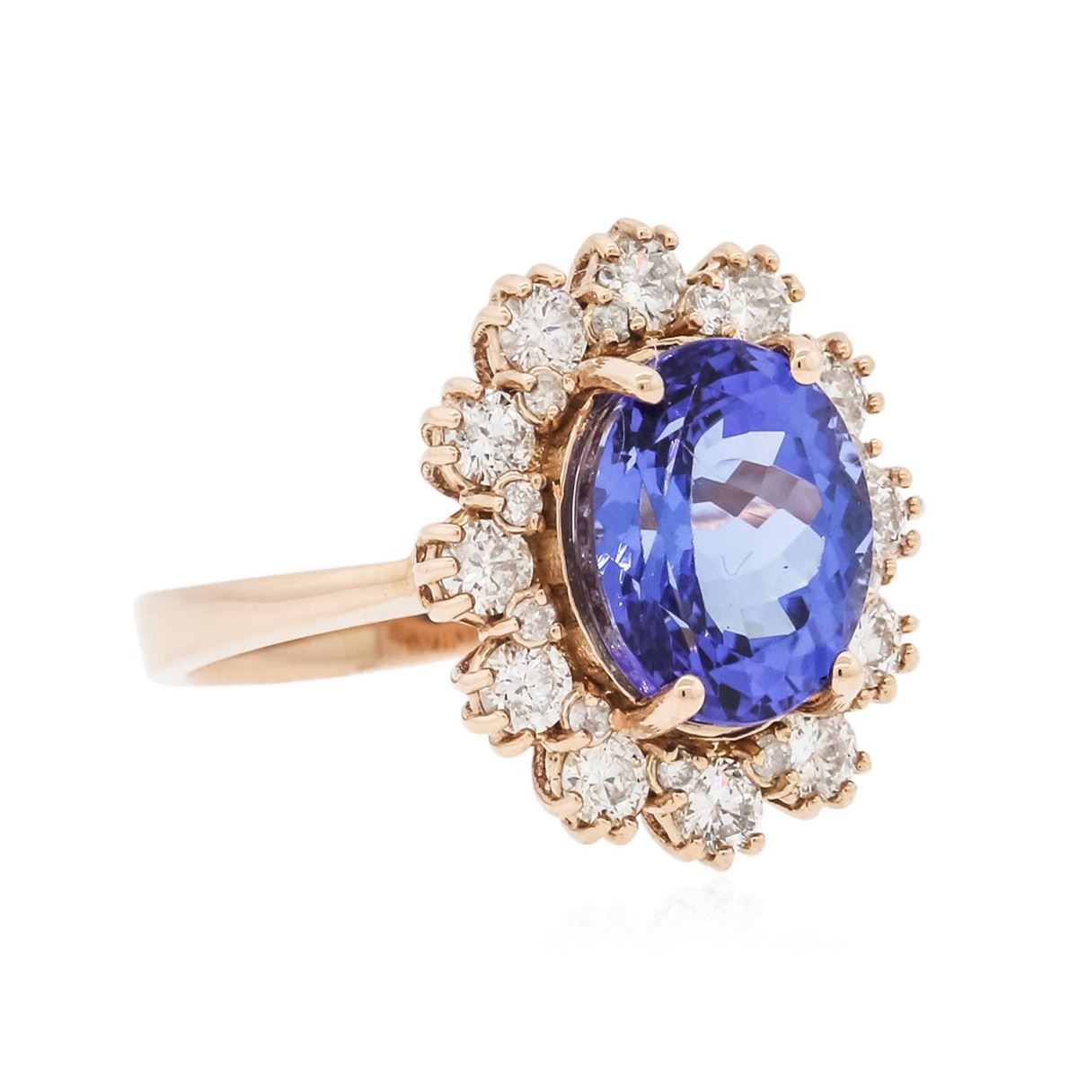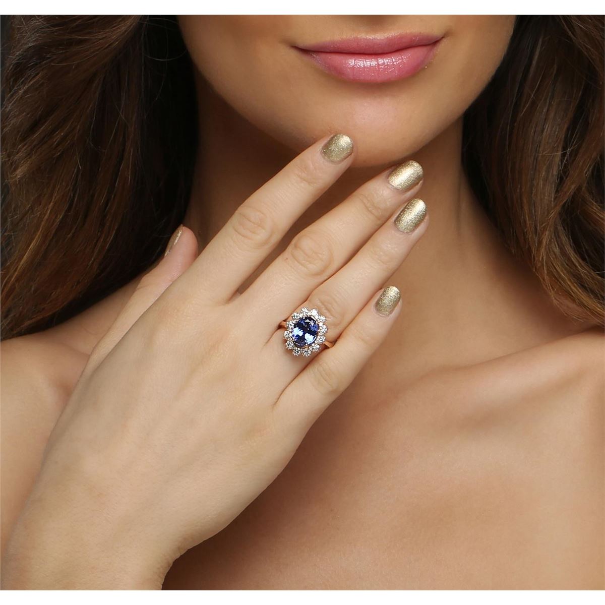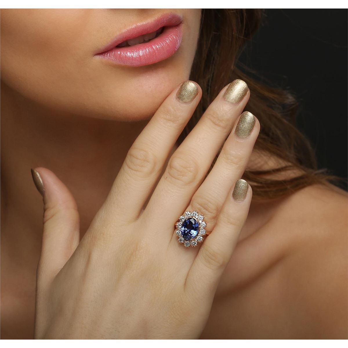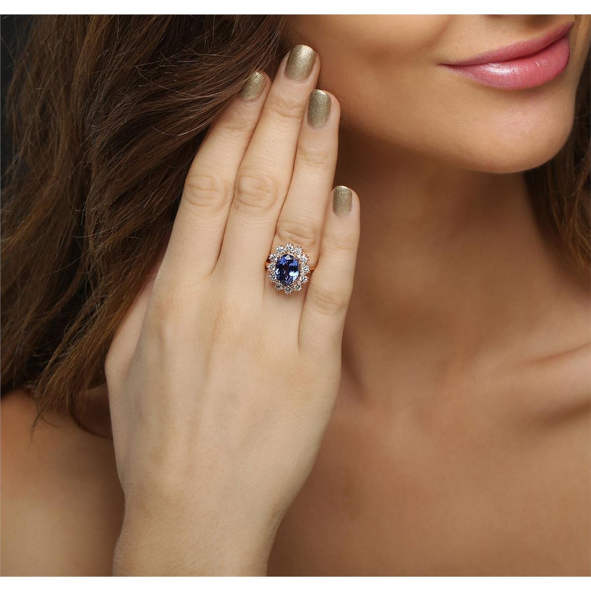 One electronically tested 14KT rose gold ladies combination cast & assembled ring with a bright polish finish. Condition is new. Identified with markings of "K14". Containing: One prong set oval modified brilliant cut natural tanzanite, measuring 10.67 x 8.50 x 6.56mm, approximate weight of 4.04ct., clarity is eye clean, type I, medium, moderately strong, bluish violet color, (GIA bV 5/4), cut is good. Twelve prong set round brilliant cut diamonds, measuring 2.50 - 2.50 x 1.50mm (depth est.) approximate. Total Weight of 12 Stones = 0.69ct. Clarity: SI-1 to SI-2. Color: K - L, Cut is Good. Twelve prong set round brilliant cut diamonds, measuring 1.30 - 1.30 x 0.78mm (depth est.) approximate. Total Weight of 12 Stones = 0.10ct. Clarity: I-2. Color: H - I, Cut is Good. Colored gemstones are presumed to have been subjected to commonly used enhancement processes. All diamonds and colored gemstones are graded in the mounting, unless otherwise stated. Total Weight of Colored Stones 4.04ct. Total Weight of Diamonds 0.78ct. Total Weight of Ring 6.20 grams. GGL Appraised at $9,555.00.