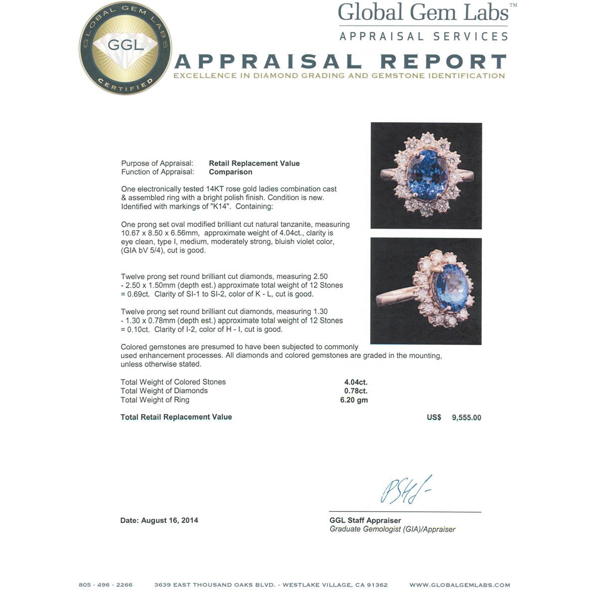 One electronically tested 14KT rose gold ladies combination cast & assembled ring with a bright polish finish. Condition is new. Identified with markings of "K14". Containing: One prong set oval modified brilliant cut natural tanzanite, measuring 10.67 x 8.50 x 6.56mm, approximate weight of 4.04ct., clarity is eye clean, type I, medium, moderately strong, bluish violet color, (GIA bV 5/4), cut is good. Twelve prong set round brilliant cut diamonds, measuring 2.50 - 2.50 x 1.50mm (depth est.) approximate. Total Weight of 12 Stones = 0.69ct. Clarity: SI-1 to SI-2. Color: K - L, Cut is Good. Twelve prong set round brilliant cut diamonds, measuring 1.30 - 1.30 x 0.78mm (depth est.) approximate. Total Weight of 12 Stones = 0.10ct. Clarity: I-2. Color: H - I, Cut is Good. Colored gemstones are presumed to have been subjected to commonly used enhancement processes. All diamonds and colored gemstones are graded in the mounting, unless otherwise stated. Total Weight of Colored Stones 4.04ct. Total Weight of Diamonds 0.78ct. Total Weight of Ring 6.20 grams. GGL Appraised at $9,555.00.