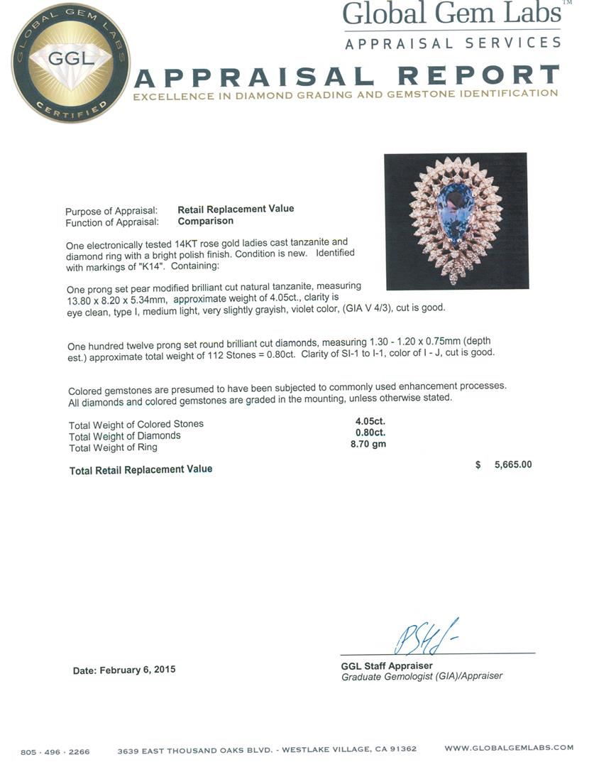 One electronically tested 14KT rose gold ladies cast tanzanite and diamond ring with a bright polish finish. Identified with markings of "K14". Condition is new. Containing: One prong set pear modified brilliant cut natural tanzanite, measuring 13.80 x 8.20 x 5.34mm, approximate weight of 4.05ct., clarity is eye clean, type I, medium light, very slightly grayish, violet color, (GIA V 4/3), cut is good. One Hundred Twelve prong set round brilliant cut diamonds, measuring 1.30 - 1.20 x 0.75mm (depth est.) approximate. total weight of 112 Stones = 0.80ct. Clarity: SI-1 to I-1. Color: I - J, Cut is Good. Colored gemstones are presumed to have been subjected to commonly used enhancement processes. All diamonds and colored gemstones are graded in the mounting, unless otherwise stated. Total Weight of Colored Stones 4.05ct. Total Weight of Diamonds 0.80ct. Total Weight of Ring 8.70 grams. GGL Appraised at $5,665.00.