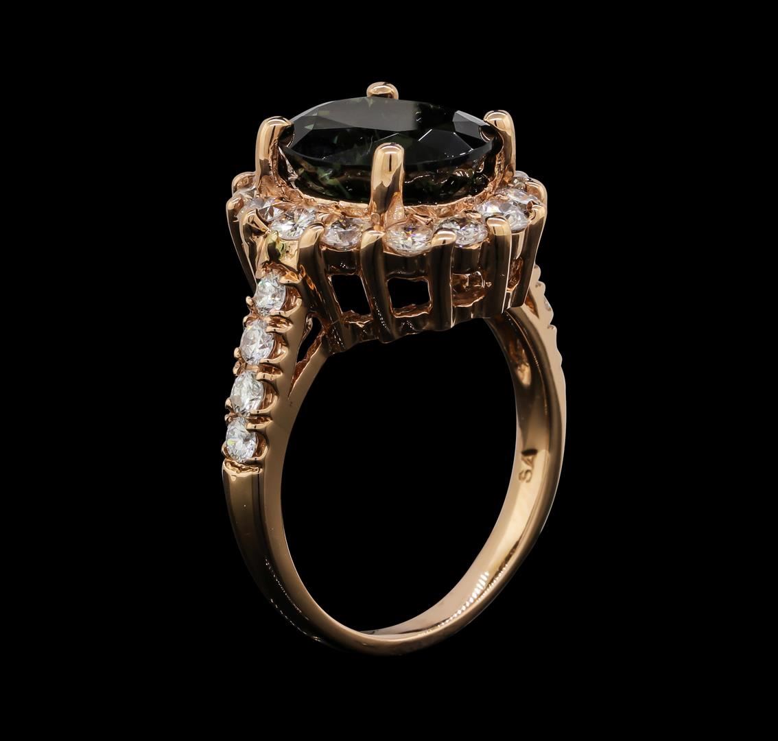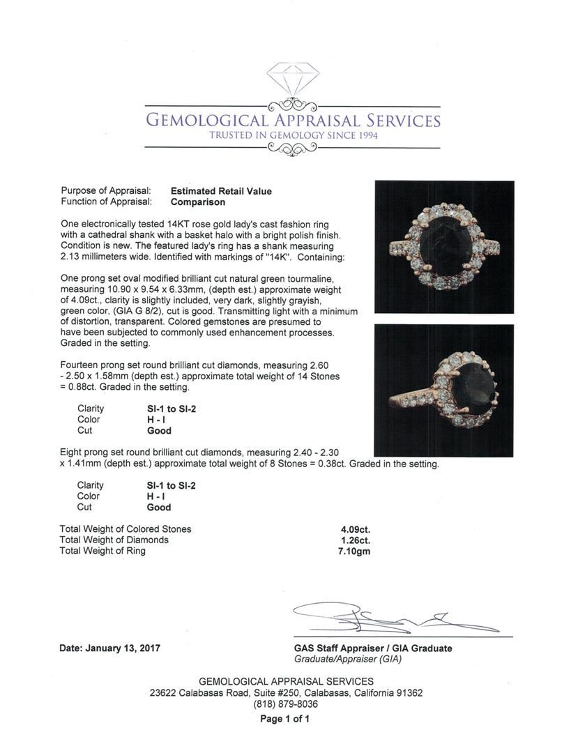 One electronically tested 14KT rose gold lady's cast fashion ring with a cathedral shank with a basket halo with a bright polish finish. The featured lady's ring has a shank measuring 2.13 millimeters wide. Identified with markings of "14K". Condition is new. Containing: One prong set oval modified brilliant cut natural green tourmaline, measuring 10.90 x 9.54 x 6.33mm, (depth est.) approximate weight of 4.09ct., clarity is slightly included, very dark, slightly grayish, green color, (GIA G 8/2), cut is good. Transmitting light with a minimum of distortion, transparent. Colored gemstones are presumed to have been subjected to commonly used enhancement processes. Graded in the setting. Fourteen prong set round brilliant cut diamonds, measuring 2.60 - 2.50 x 1.58mm (depth est.) approximate total weight of 14 Stones = 0.88ct. Graded in the setting. Clarity: SI-1 to SI-2. Color: H - ICut Good Eight prong set round brilliant cut diamonds, measuring 2.40 - 2.30 x 1.41mm (depth est.) approximate total weight of 8 Stones = 0.38ct. Graded in the setting. Clarity: SI-1 to SI-2. Color: H - ICut Good. Total Weight of Colored Stones 4.09ct. Total Weight of Diamonds 1.26ct. Total Weight of Ring 7.10gm. GAS Appraised.