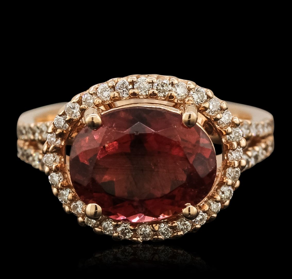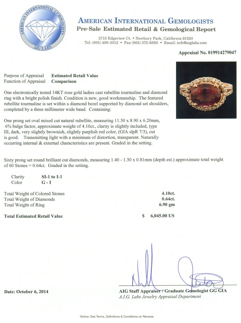 One electronically tested 14KT rose gold ladies cast rubellite tourmaline and diamond ring with a bright polish finish. The featured rubellite tourmaline is set within a diamond bezel supported by diamond set shoulders, completed by a three millimeter wide band. Condition is new, good workmanship. Containing: One prong set oval mixed cut natural rubellite, measuring 11.30 x 8.90 x 6.20mm, 6%. bulge factor, approximate weight of 4.10ct., clarity is slightly included, type III, dark, very slightly brownish, slightly purplish red color, (GIA slpR 7/3), cut is good. Transmitting light with a minimum of distortion, transparent. Naturally occurring internal & external characteristics are present. Graded in the setting. Sixty prong set round brilliant cut diamonds, measuring 1.40 - 1.30 x 0.81mm (depth est.) approximate. Total Weight of 60 Stones = 0.64ct. Graded in the setting. Clarity: SI-1 to I-1. Color: G - I. Total Weight of Colored Stones 4.10ct. Total Weight of Diamonds 0.64ct. Total Weight of Ring 6.90gm. AIG Appraised at $6,045.00.