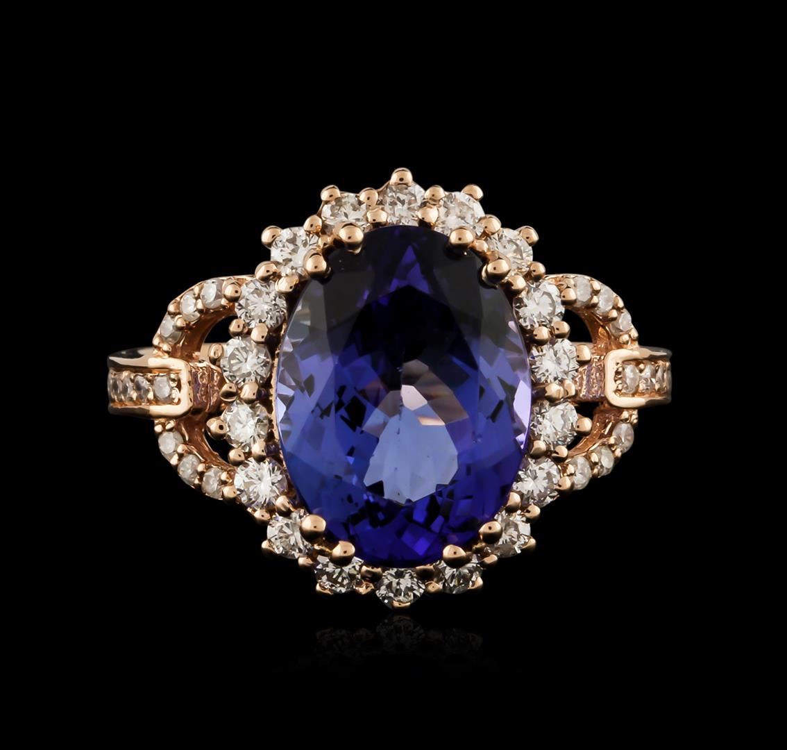 One electronically tested 14KT rose gold ladies cast tanzanite and diamond ring with a bright polish finish. Identified with markings of "K14". Condition is new. Containing: One prong set oval modified brilliant cut natural tanzanite, measuring 11.70 x 8.80 x 5.70mm, approximate weight of 4.13ct., clarity is eye clean, type I, medium light, very slightly grayish, bluish violet color, (GIA bV 4/3), cut is good. Forty-Six prong set round brilliant cut diamonds, measuring 1.50 - 1.00 x 0.75mm (depth est.) approximate total weight of 46 Stones = 0.33ct. Clarity: SI-1 to I-1. Color: H - I, Cut is Good. Colored gemstones are presumed to have been subjected to commonly used enhancement processes. All diamonds and colored gemstones are graded in the mounting, unless otherwise stated. Total Weight of Colored Stones 4.13ct. Total Weight of Diamonds 0.33ct. Total Weight of Ring 4.30 grams. GGL Appraised at $4,740.00.