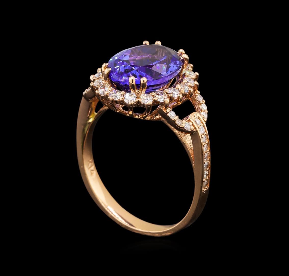 One electronically tested 14KT rose gold ladies cast tanzanite and diamond ring with a bright polish finish. Identified with markings of "K14". Condition is new. Containing: One prong set oval modified brilliant cut natural tanzanite, measuring 11.70 x 8.80 x 5.70mm, approximate weight of 4.13ct., clarity is eye clean, type I, medium light, very slightly grayish, bluish violet color, (GIA bV 4/3), cut is good. Forty-Six prong set round brilliant cut diamonds, measuring 1.50 - 1.00 x 0.75mm (depth est.) approximate total weight of 46 Stones = 0.33ct. Clarity: SI-1 to I-1. Color: H - I, Cut is Good. Colored gemstones are presumed to have been subjected to commonly used enhancement processes. All diamonds and colored gemstones are graded in the mounting, unless otherwise stated. Total Weight of Colored Stones 4.13ct. Total Weight of Diamonds 0.33ct. Total Weight of Ring 4.30 grams. GGL Appraised at $4,740.00.