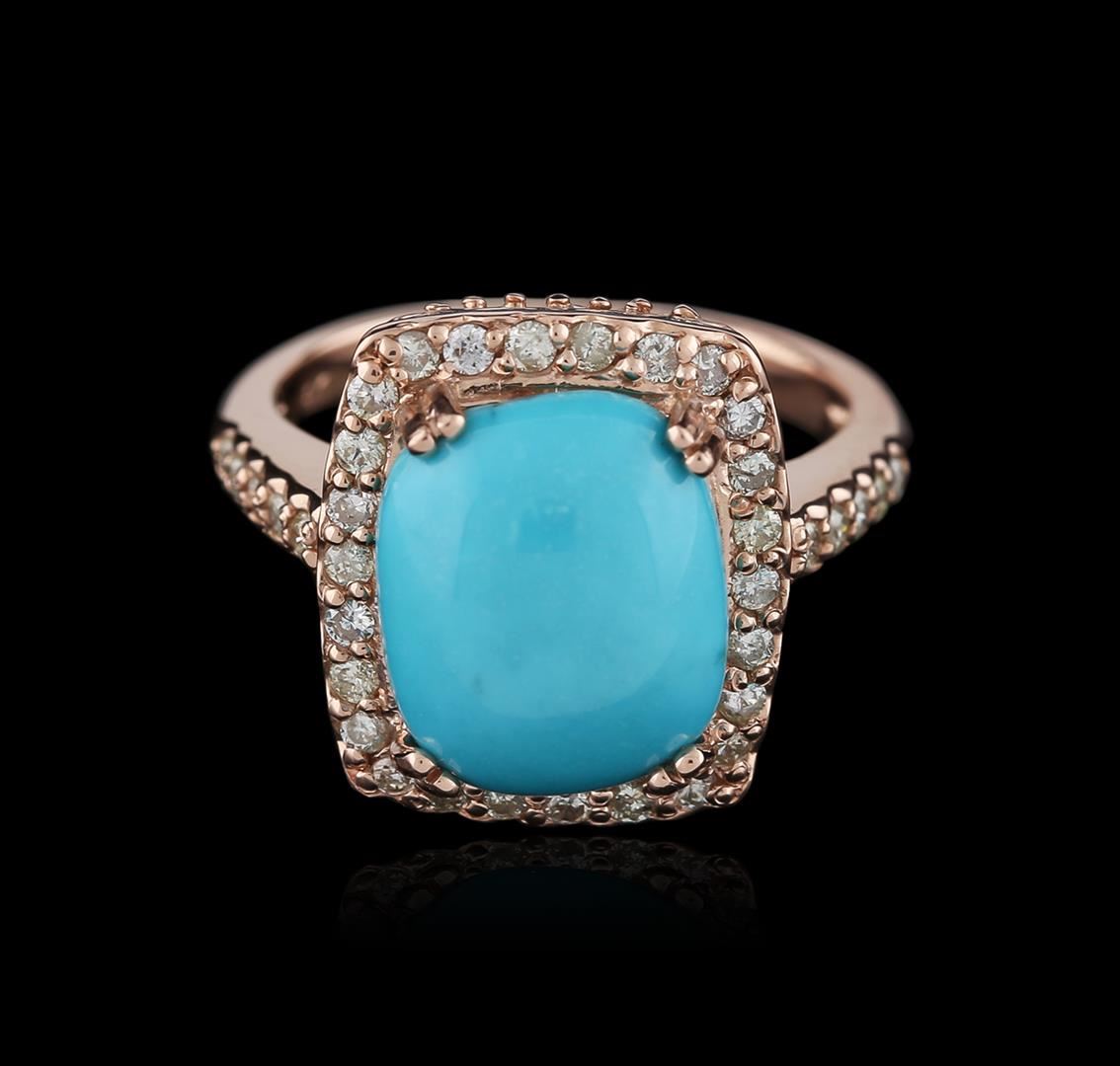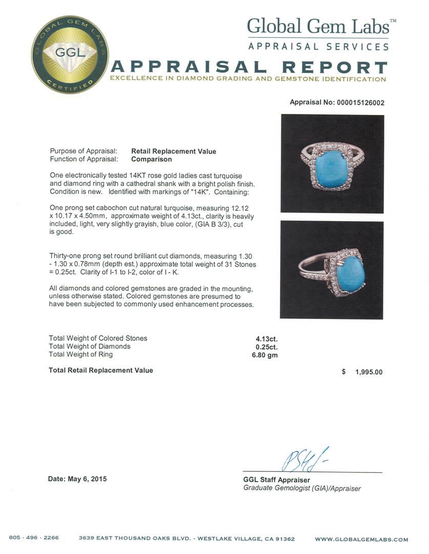 One electronically tested 14KT rose gold ladies cast turquoise and diamond ring with a cathedral shank with a bright polish finish. Identified with markings of "14K". Condition is new. Containing: One prong set cabochon cut natural turquoise, measuring 12.12 x 10.17 x 4.50mm, approximate weight of 4.13ct., clarity is heavily included, light, very slightly grayish, blue color, (GIA B 3/3), cut is good. Thirty-One prong set round brilliant cut diamonds, measuring 1.30 - 1.30 x 0.78mm (depth est.) approximate total weight of 31 Stones = 0.25ct. Clarity: I-1 to I-2. Color: I - K. All diamonds and colored gemstones are graded in the mounting, unless otherwise stated. Colored gemstones are presumed to have been subjected to commonly used enhancement processes.. Total Weight of Colored Stones 4.13ct. Total Weight of Diamonds 0.25ct. Total Weight of Ring 6.80 grams. GGL Appraised at $1,995.00.