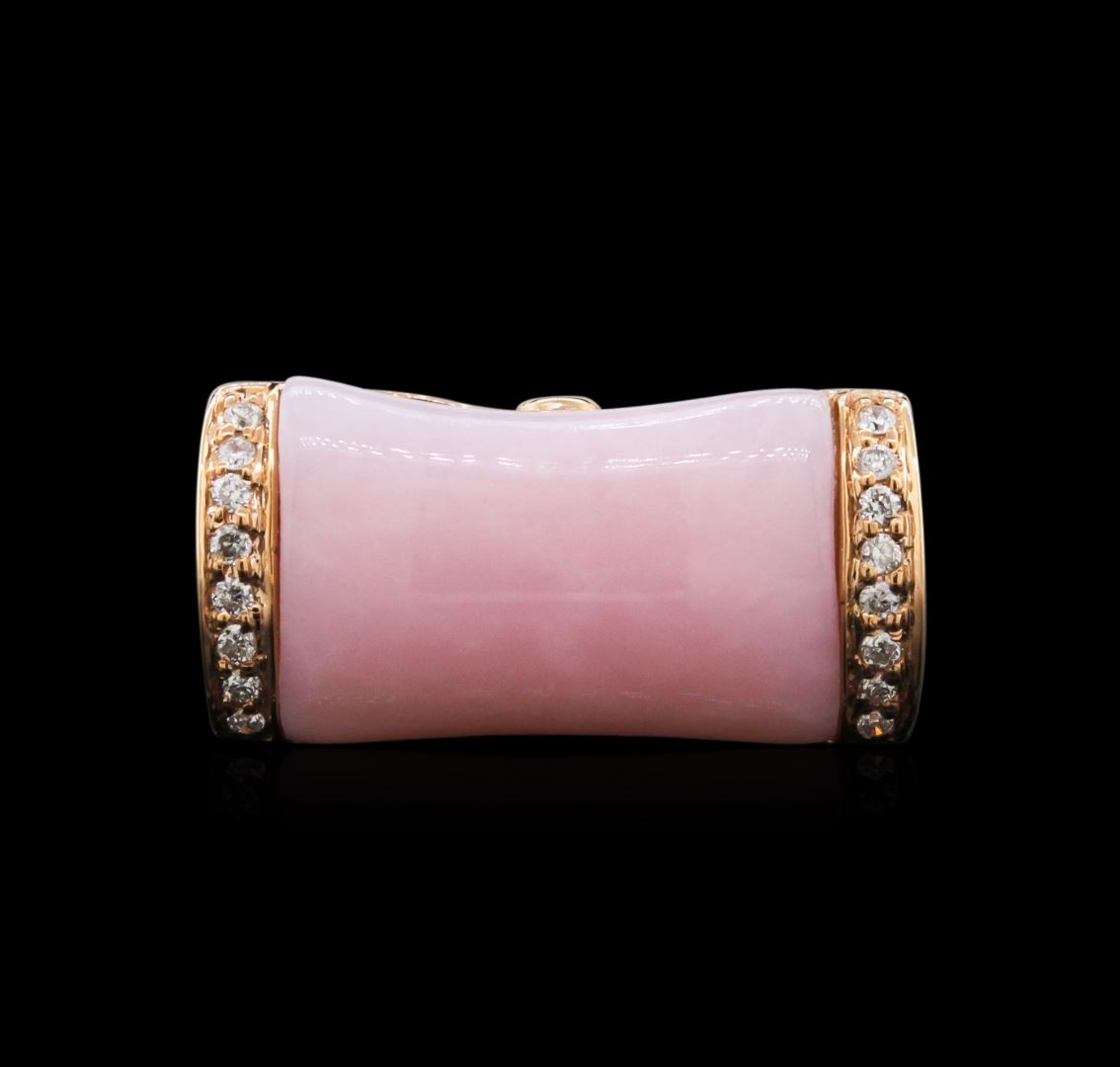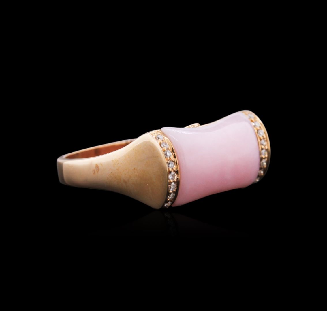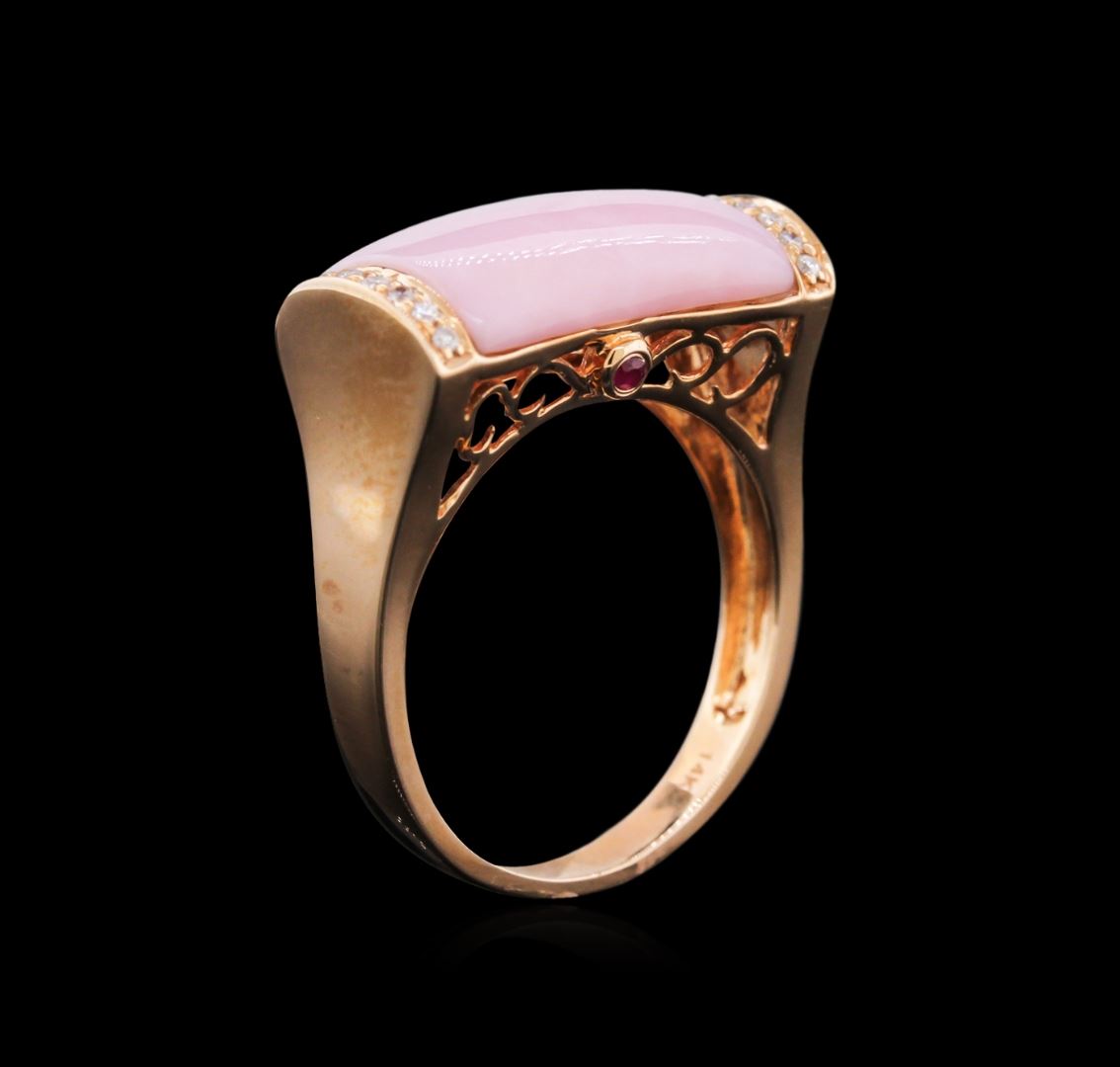 One ring featuring: 14KT rose gold weighing 4.08 grams containing one pink opal center stone with a total weight of 4.20ct, two hot pink rubies with a total weight of 0.03ct, and 16 round diamonds with a total weight of 0.08ct.