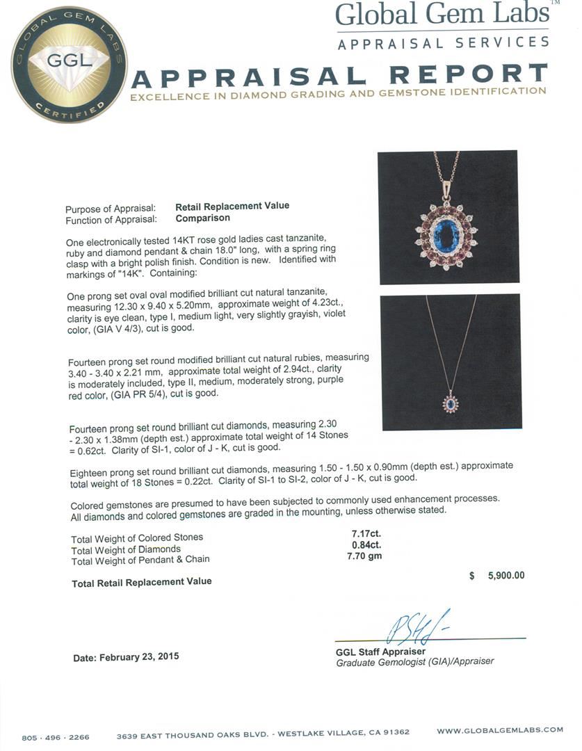 One electronically tested 14KT rose gold ladies cast tanzanite, ruby and diamond pendant & chain 18.0" long, with a spring ring clasp with a bright polish finish. Identified with markings of "14K". Condition is new. Containing: One prong set oval oval modified brilliant cut natural tanzanite, measuring 12.30 x 9.40 x 5.20mm, approximate weight of 4.23ct., clarity is eye clean, type I, medium light, very slightly grayish, violet color, (GIA V 4/3), cut is good. Fourteen prong set round modified brilliant cut natural rubies, measuring 3.40 - 3.40 x 2.21 mm, approximate total weight of 2.94ct., clarity is moderately included, type II, medium, moderately strong, purple red color, (GIA PR 5/4), cut is good. Fourteen prong set round brilliant cut diamonds, measuring 2.30 - 2.30 x 1.38mm (depth est.) approximate total weight of 14 Stones = 0.62ct. Clarity: SI-1. Color: J - K, Cut is Good. Eighteen prong set round brilliant cut diamonds, measuring 1.50 - 1.50 x 0.90mm (depth est.) approximate total weight of 18 Stones = 0.22ct. Clarity: SI-1 to SI-2. Color: J - K, Cut is Good. Colored gemstones are presumed to have been subjected to commonly used enhancement processes. All diamonds and colored gemstones are graded in the mounting, unless otherwise stated. Total Weight of Colored Stones 7.17ct. Total Weight of Diamonds 0.84ct. Total Weight of Pendant & Chain 7.70 grams. GGL Appraised at $5,900.00.