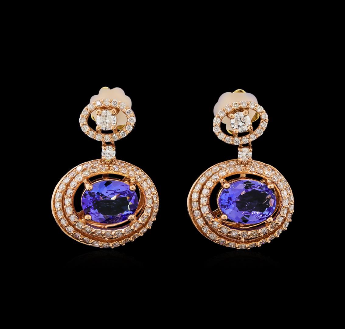One pair electronically tested Gold-Rose-14KT ladies cast tanzanite and diamond earrings with friction posts with a bright polish finish. Identified with markings of "585". Condition is new. Containing: Two prong set oval modified brilliant cut natural tanzanites, measuring 9.50 x 7.00. x 4.55mm, approximate total weight of 4.26ct., clarity is eye clean, type I, medium light, very slightly grayish, violet color, (GIA V 4/3), cut is good. Two prong set round brilliant cut diamonds, measuring 3.00. - 3.00. x 1.80mm (depth est.) approximate total weight of 2 Stones = 0.20ct. Clarity: SI-1 to SI. Color: J, Cut is Good. Two prong set round brilliant cut diamonds, measuring 2.10 - 2.10 x 1.26mm (depth est.) approximate total weight of 2 Stones = 0.07ct. Clarity: SI-1 to SI-2. Color: I - J. One Hundred Forty prong set round brilliant cut diamonds, measuring 1.30 - 1.30 x 0.78mm (depth est.) approximate total weight of 140 Stones = 1.12ct. Clarity: SI-2 to I-1. Color: I - J. Colored gemstones are presumed to have been subjected to commonly used enhancement processes. All diamonds and colored gemstones are graded in the mounting, unless otherwise stated. Total Weight of Colored Stones 4.26ct. Total Weight of Diamonds 1.39ct. Total Weight of Earrings 8.40 grams. GGL Appraised at $5,600.00.