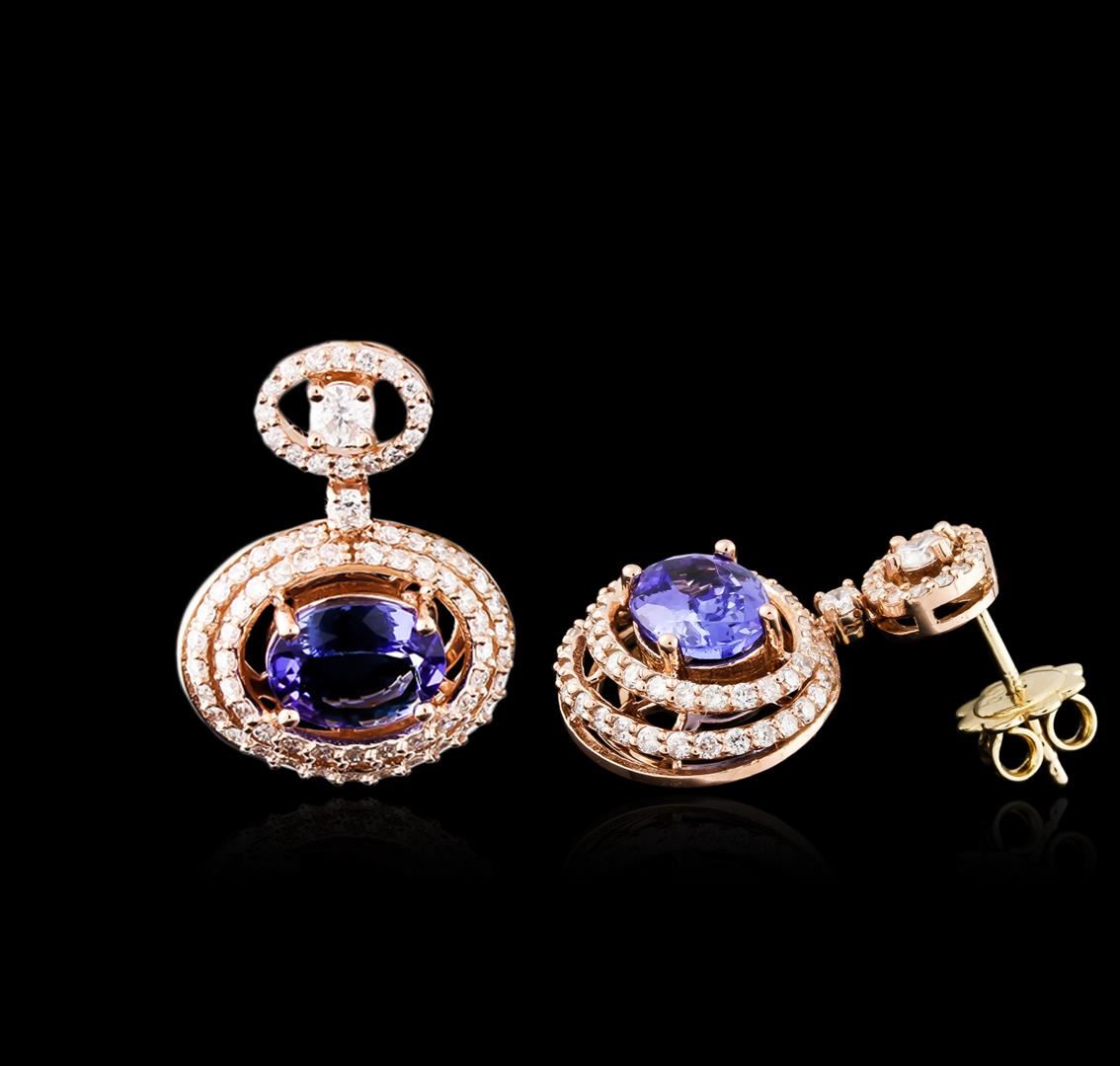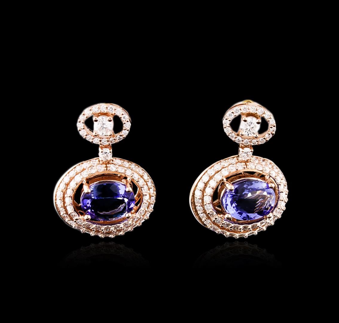 One pair electronically tested Gold-Rose-14KT ladies cast tanzanite and diamond earrings with friction posts with a bright polish finish. Identified with markings of "585". Condition is new. Containing: Two prong set oval modified brilliant cut natural tanzanites, measuring 9.50 x 7.00. x 4.55mm, approximate total weight of 4.26ct., clarity is eye clean, type I, medium light, very slightly grayish, violet color, (GIA V 4/3), cut is good. Two prong set round brilliant cut diamonds, measuring 3.00. - 3.00. x 1.80mm (depth est.) approximate total weight of 2 Stones = 0.20ct. Clarity: SI-1 to SI. Color: J, Cut is Good. Two prong set round brilliant cut diamonds, measuring 2.10 - 2.10 x 1.26mm (depth est.) approximate total weight of 2 Stones = 0.07ct. Clarity: SI-1 to SI-2. Color: I - J. One Hundred Forty prong set round brilliant cut diamonds, measuring 1.30 - 1.30 x 0.78mm (depth est.) approximate total weight of 140 Stones = 1.12ct. Clarity: SI-2 to I-1. Color: I - J. Colored gemstones are presumed to have been subjected to commonly used enhancement processes. All diamonds and colored gemstones are graded in the mounting, unless otherwise stated. Total Weight of Colored Stones 4.26ct. Total Weight of Diamonds 1.39ct. Total Weight of Earrings 8.40 grams. GGL Appraised at $5,600.00.