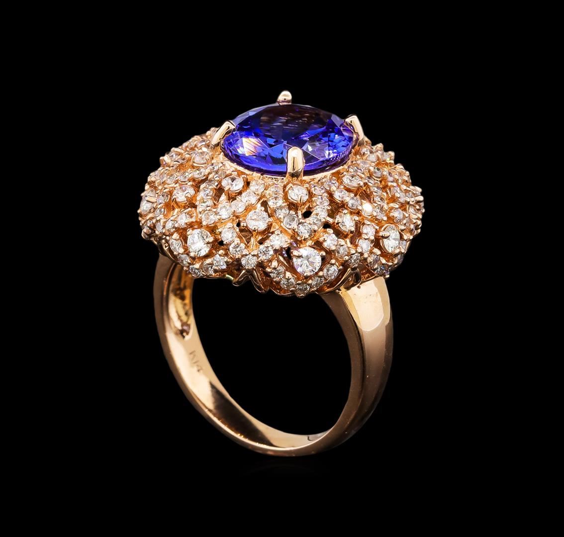 One electronically tested 14KT rose gold ladies cast tanzanite and diamond ring with a bright polish finish. Identified with markings of "14K". Condition is new. Containing: One prong set oval modified brilliant cut natural tanzanite, measuring 11.20 x 9.20 x 5.99mm, approximate weight of 4.34ct., clarity is eye clean, type I, medium, moderately strong, violet color, (GIA V 5/4), cut is good. Two Hundred Eighty prong set round brilliant cut diamonds, measuring 2.00 - 1.20 x 0.96mm (depth est.) approximate total weight of 280 Stones = 2.00ct. Clarity: SI-2 to I-1. Color: H - I, Cut is Good. Colored gemstones are presumed to have been subjected to commonly used enhancement processes. All diamonds and colored gemstones are graded in the mounting, unless otherwise stated. Total Weight of Colored Stones 4.34ct. Total Weight of Diamonds 2.00ct. Total Weight of Ring 9.50 grams. GGL Appraised at $6,700.00.