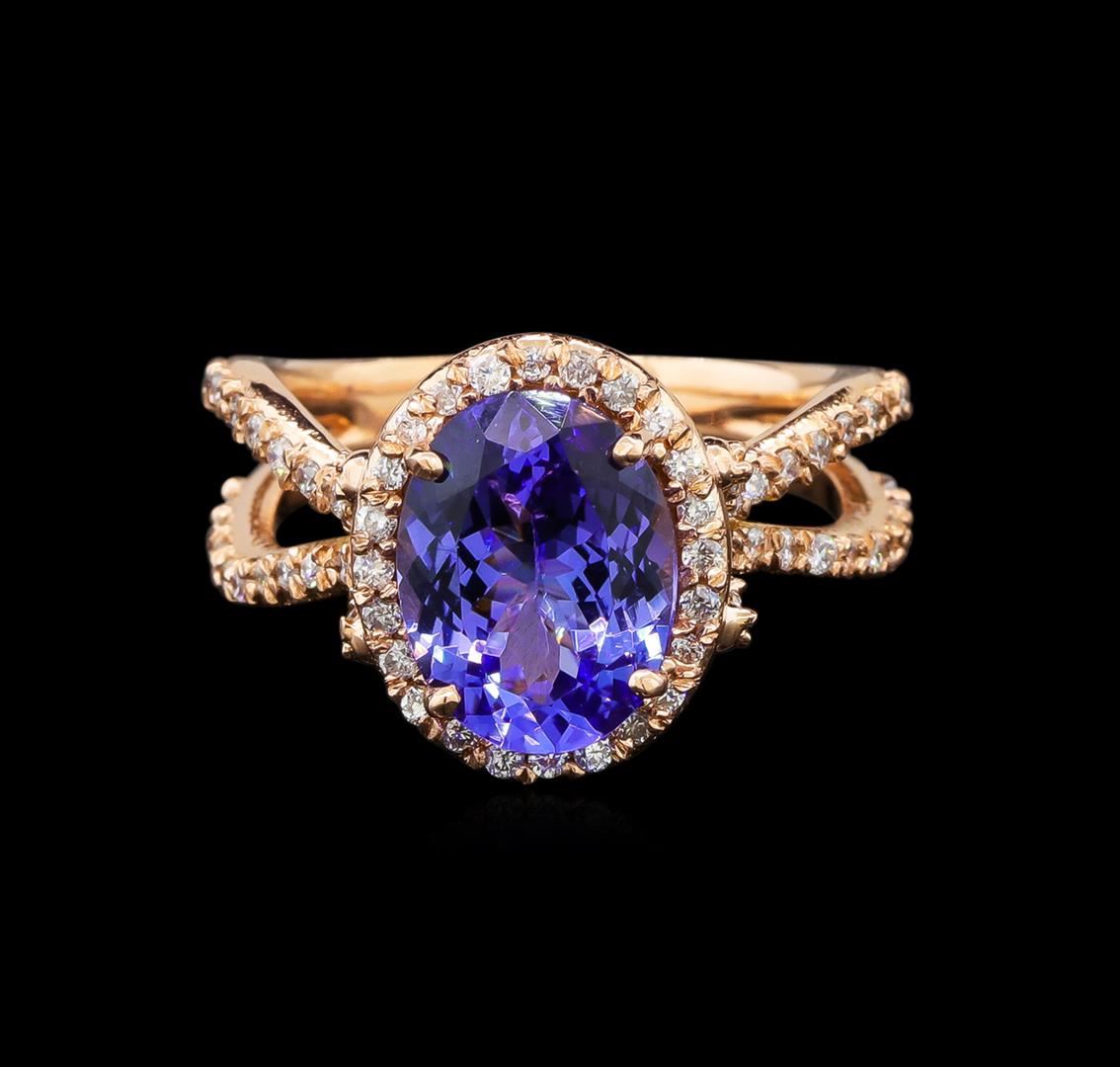 One electronically tested 14KT rose gold ladies cast tanzanite and diamond ring with a bright polish finish. Identified with markings of "14K". Condition is new. Containing: One prong set oval oval modified brilliant cut natural tanzanite, measuring 10.90 x 8.27 x 6.84mm, approximate weight of 4.34ct., clarity is eye clean, type I, medium light, very slightly grayish, violet color, (GIA V 4/3), cut is good. Ninety prong set round brilliant cut diamonds, measuring 1.20 - 1.20 x 0.72mm (depth est.) approximate total weight of 90 Stones = 0.57ct. Clarity: SI-2 to I-2. Color: J - K, Cut is Good. Colored gemstones are presumed to have been subjected to commonly used enhancement processes. All diamonds and colored gemstones are graded in the mounting, unless otherwise stated. Total Weight of Colored Stones 4.34ct. Total Weight of Diamonds 0.57ct. Total Weight of Ring 6.50 grams. GGL Appraised at $4,545.00.
