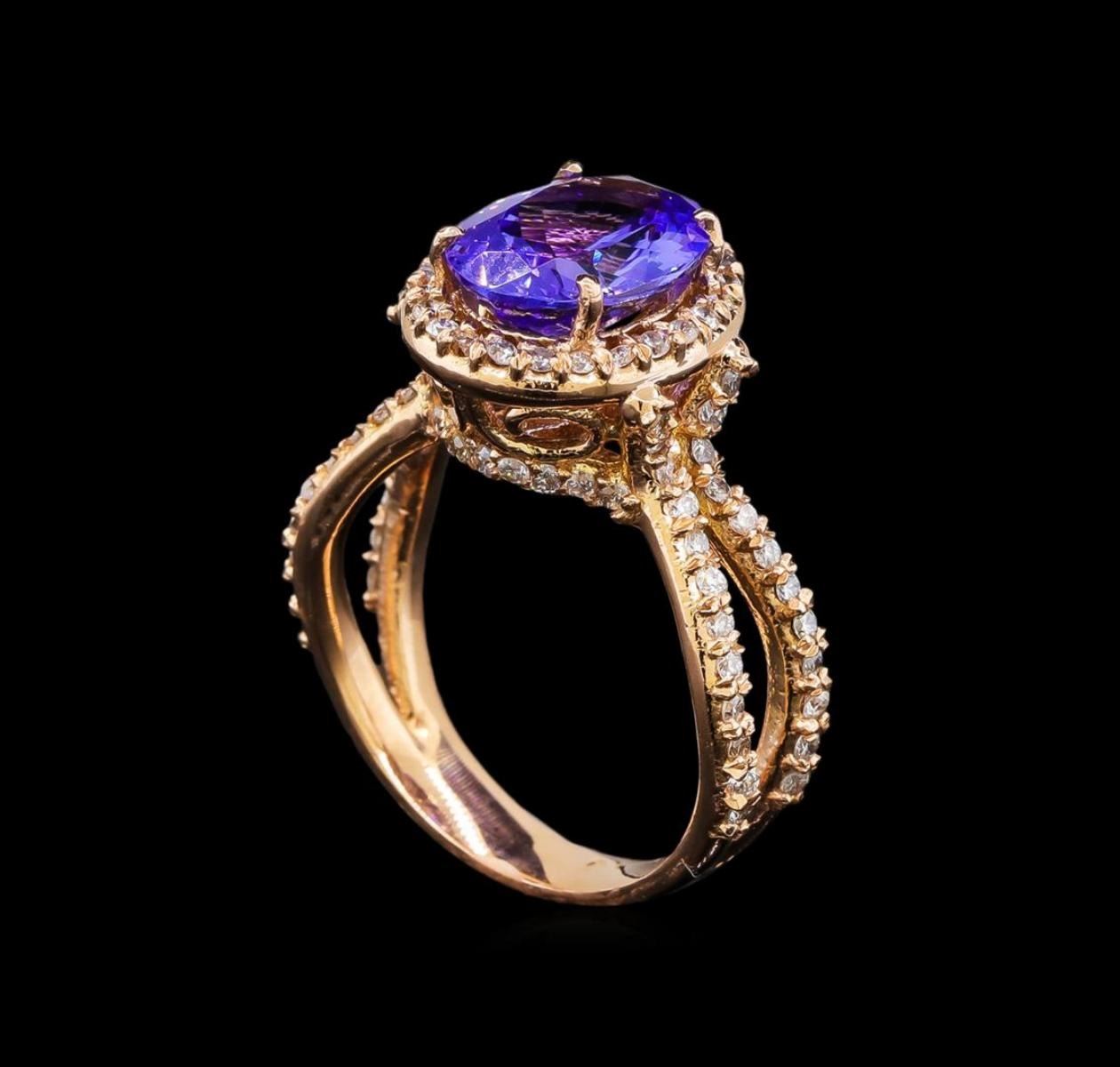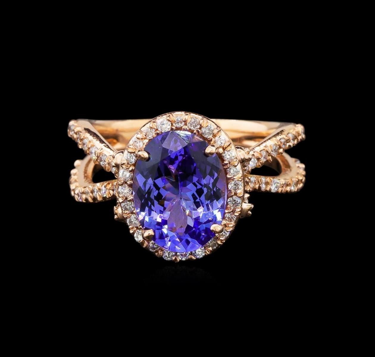 One electronically tested 14KT rose gold ladies cast tanzanite and diamond ring with a bright polish finish. Identified with markings of "14K". Condition is new. Containing: One prong set oval oval modified brilliant cut natural tanzanite, measuring 10.90 x 8.27 x 6.84mm, approximate weight of 4.34ct., clarity is eye clean, type I, medium light, very slightly grayish, violet color, (GIA V 4/3), cut is good. Ninety prong set round brilliant cut diamonds, measuring 1.20 - 1.20 x 0.72mm (depth est.) approximate total weight of 90 Stones = 0.57ct. Clarity: SI-2 to I-2. Color: J - K, Cut is Good. Colored gemstones are presumed to have been subjected to commonly used enhancement processes. All diamonds and colored gemstones are graded in the mounting, unless otherwise stated. Total Weight of Colored Stones 4.34ct. Total Weight of Diamonds 0.57ct. Total Weight of Ring 6.50 grams. GGL Appraised.